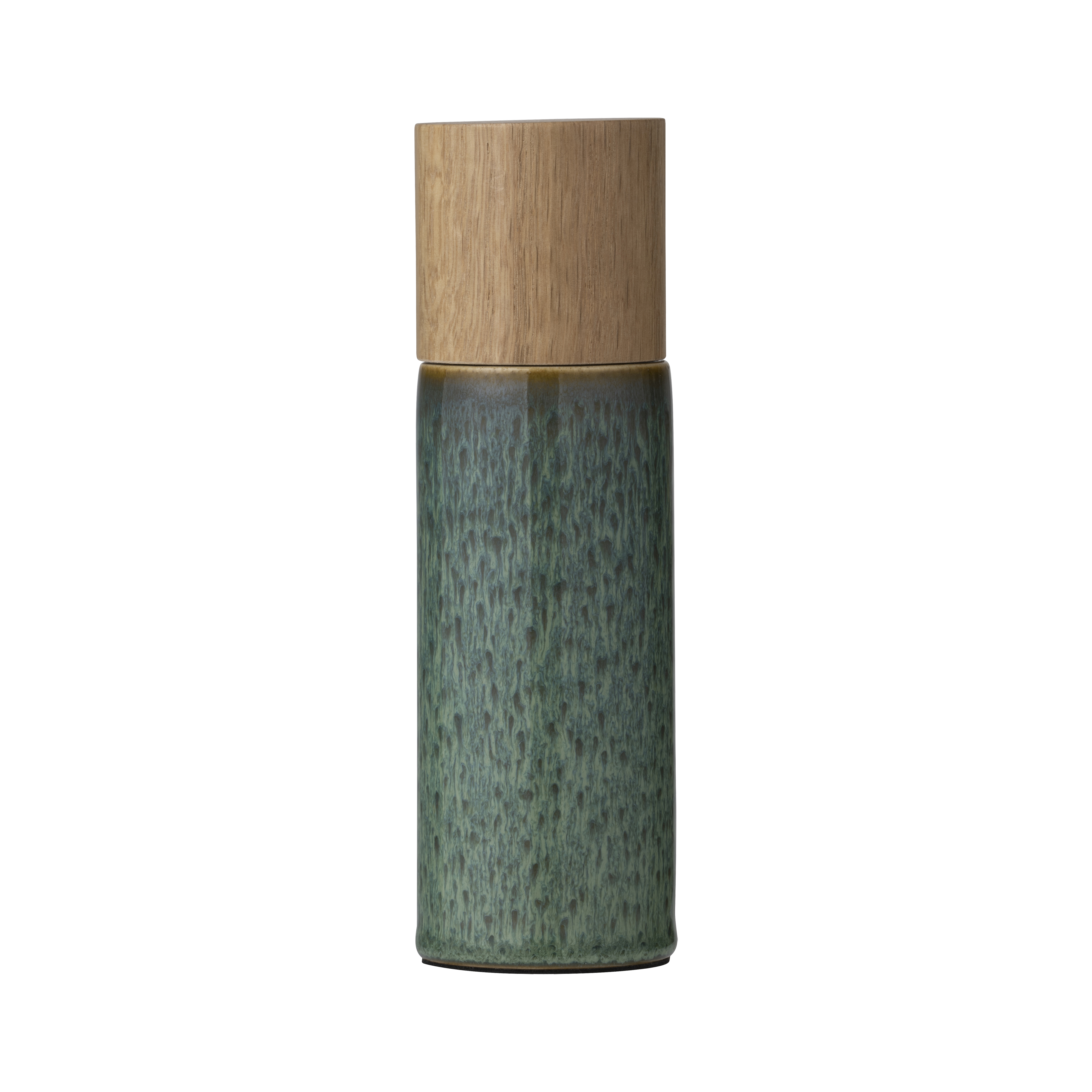 Peberkværn i blankglaseret stentøj med top i egetræ. Den smukke farve passer til de øvrige produkter i BITZ’ farverige stentøjsserie, hvor den reaktive glasur giver hvert enkelt produkt sit helt unikke spil.