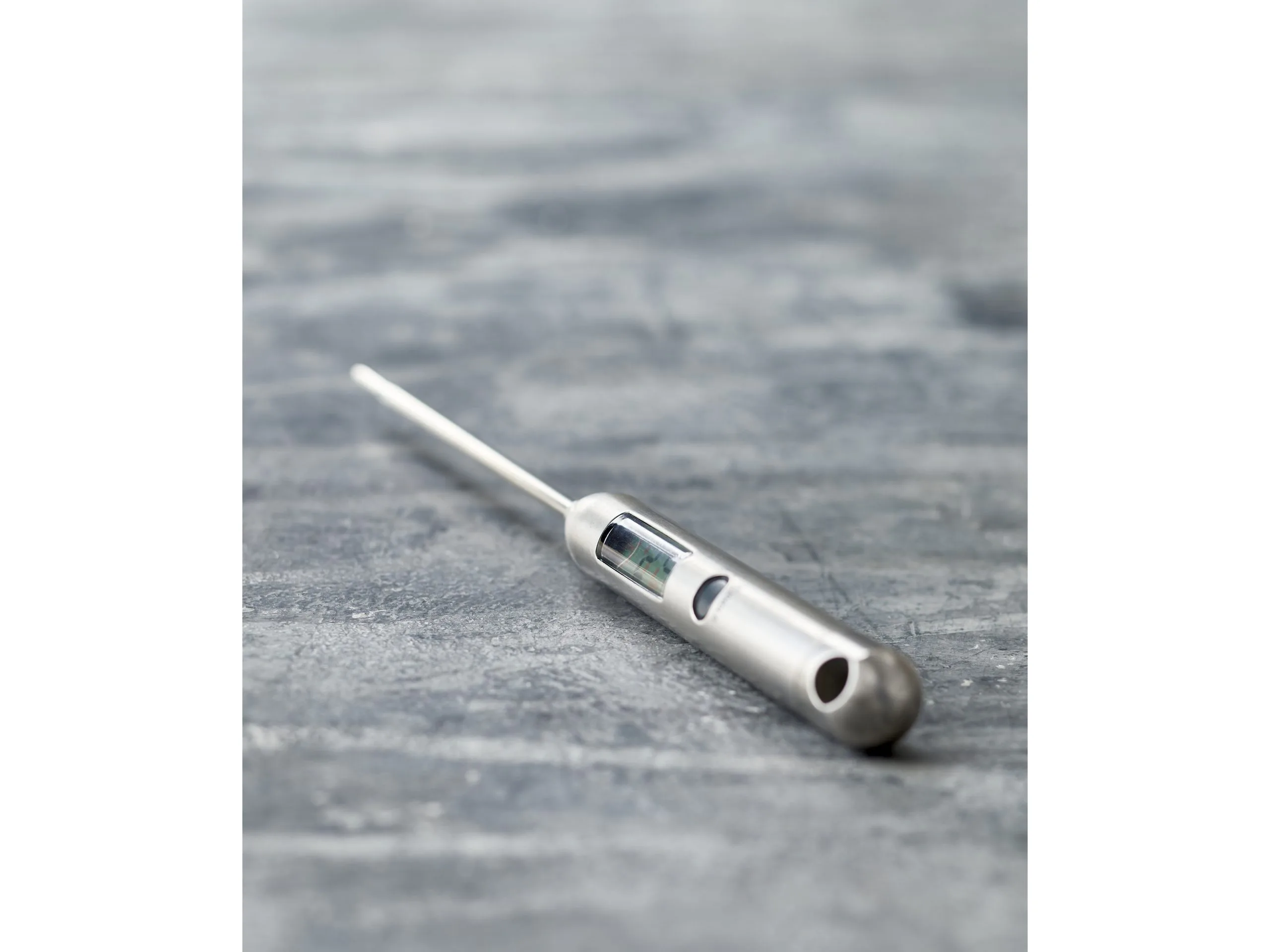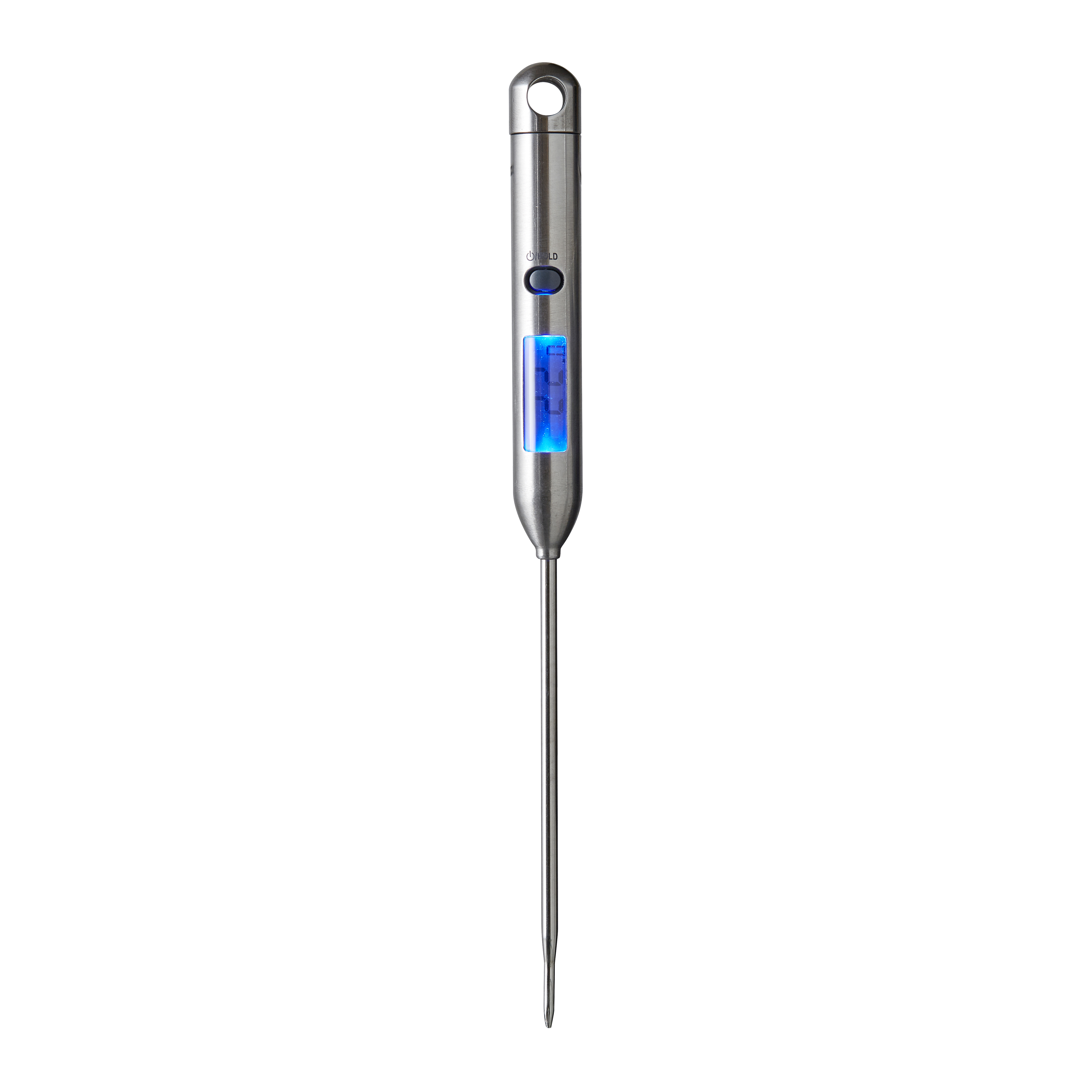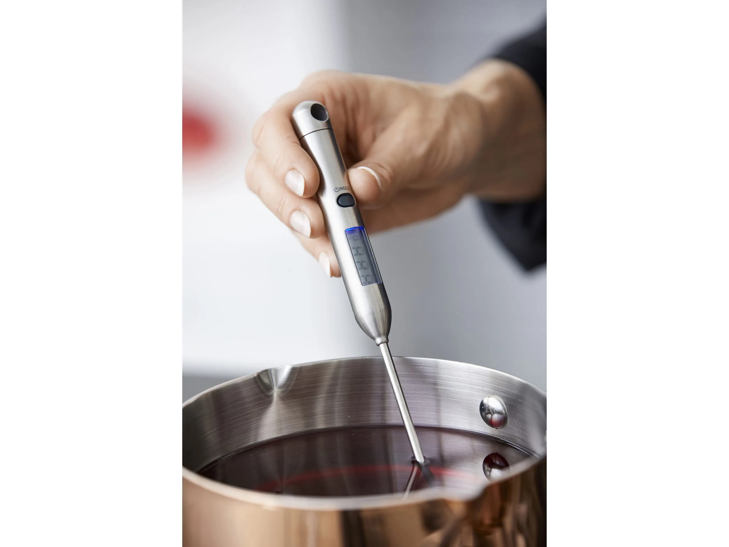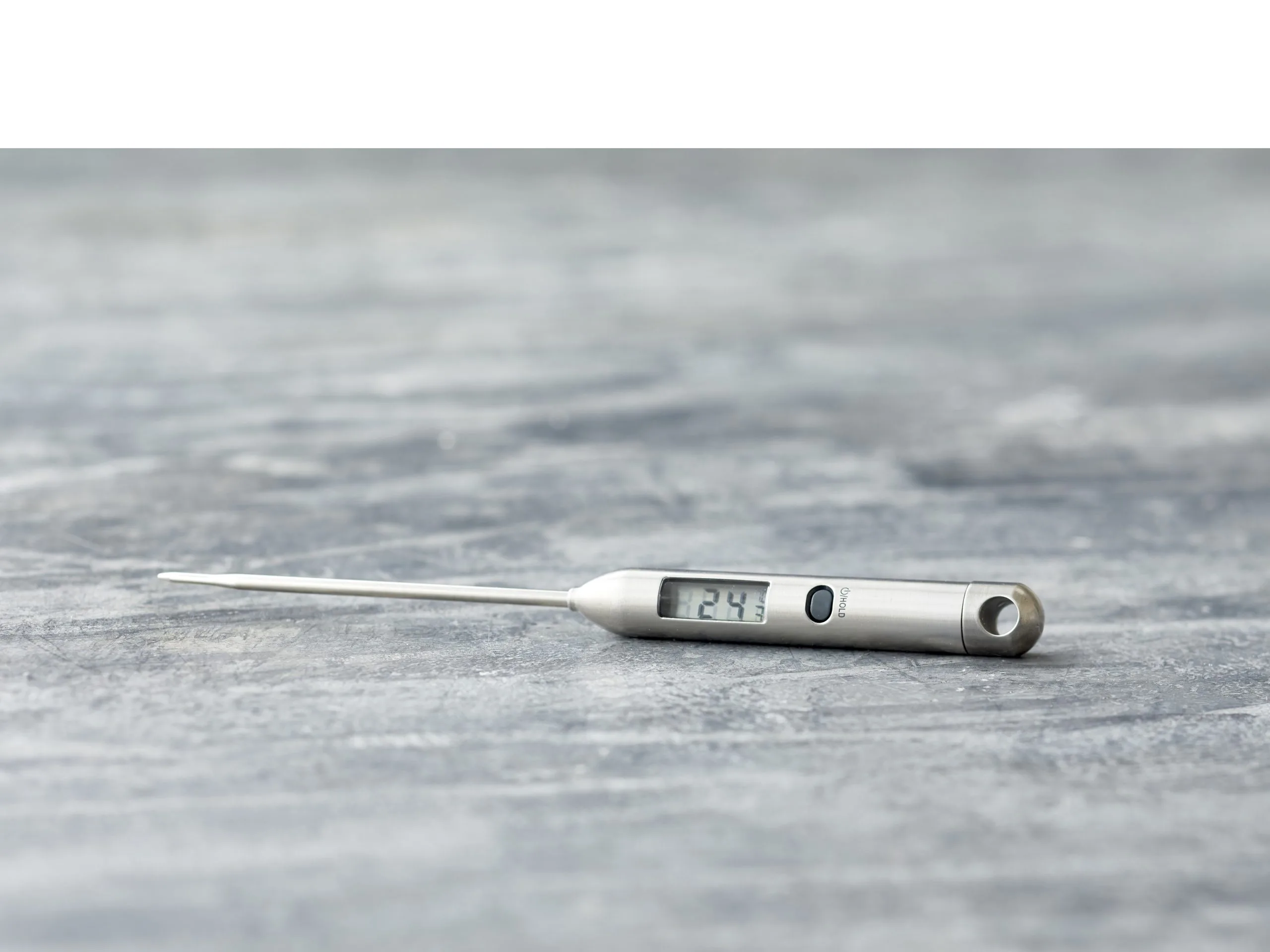 Smart og enkelt digitalt termometer med LCD display på 27 x 10 mm med blåt baggrundslys. Kan bruges til mange forskellige opgaver i køkkenet, fx fremstilling af bolcher. Måler temperaturer mellem -45 og +200 °C. Greb og temperaturspyd er i rustfrit stål. Bruger 3 x LR44 batteri som er inkluderet.
