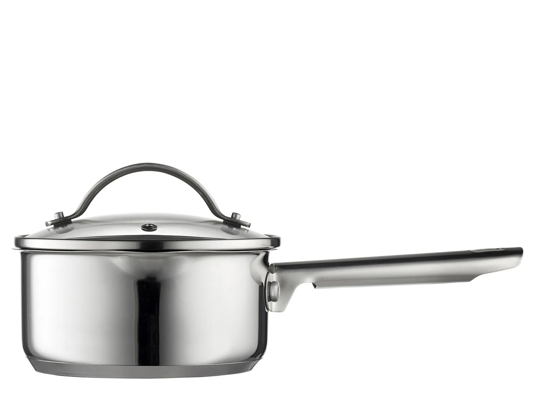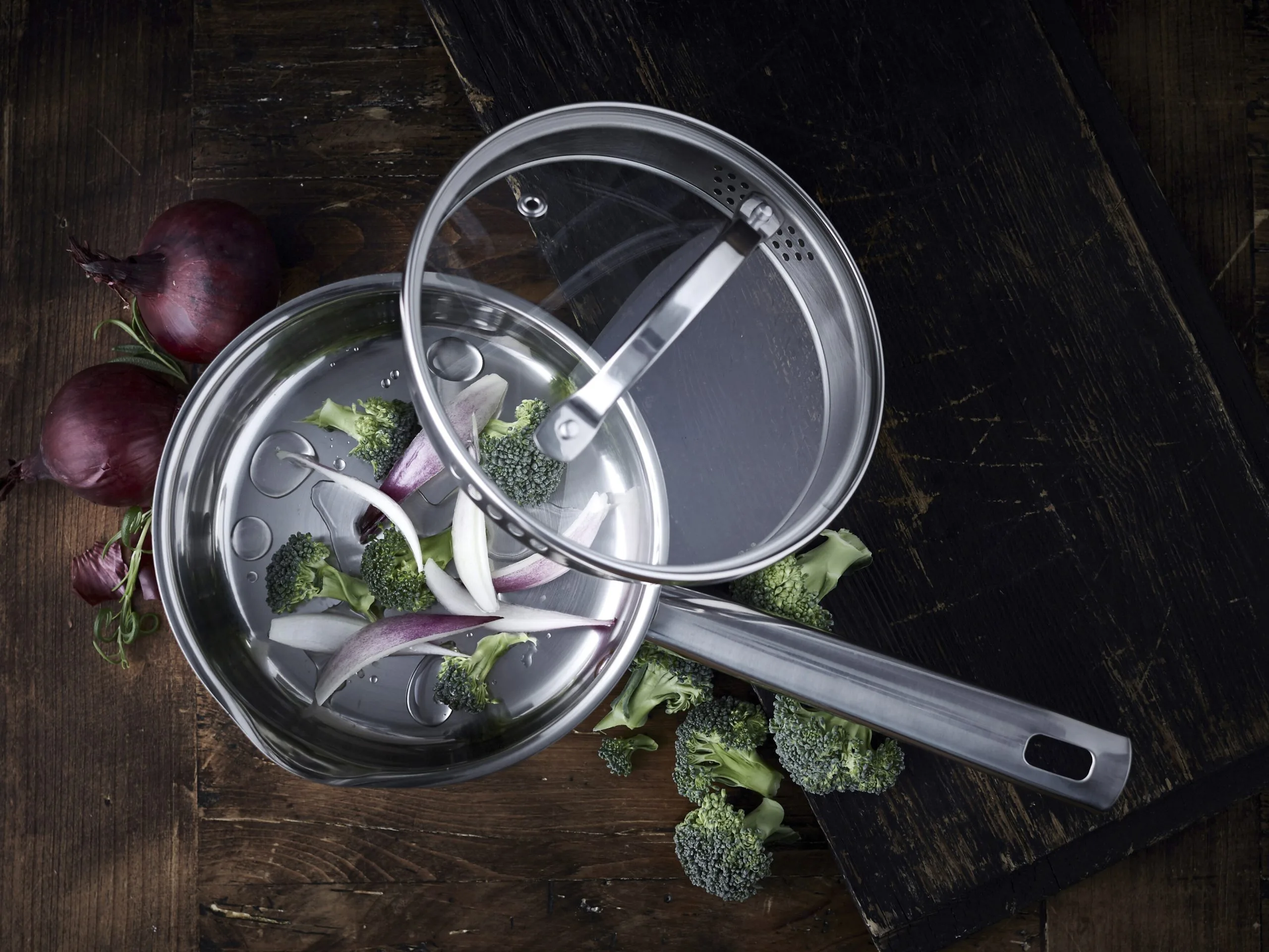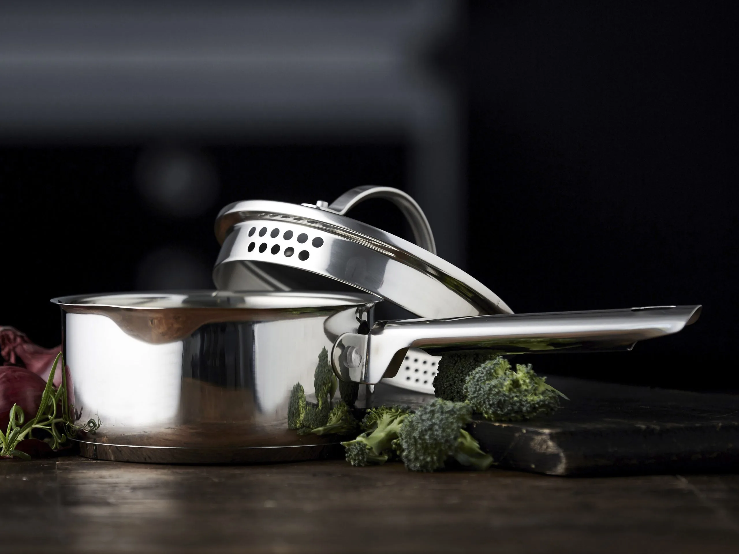 Glaslåg med si-funktion på to sider af låget, hvilket sikrer, at vand kan hældes fra gryden uden at indhold kommer med.