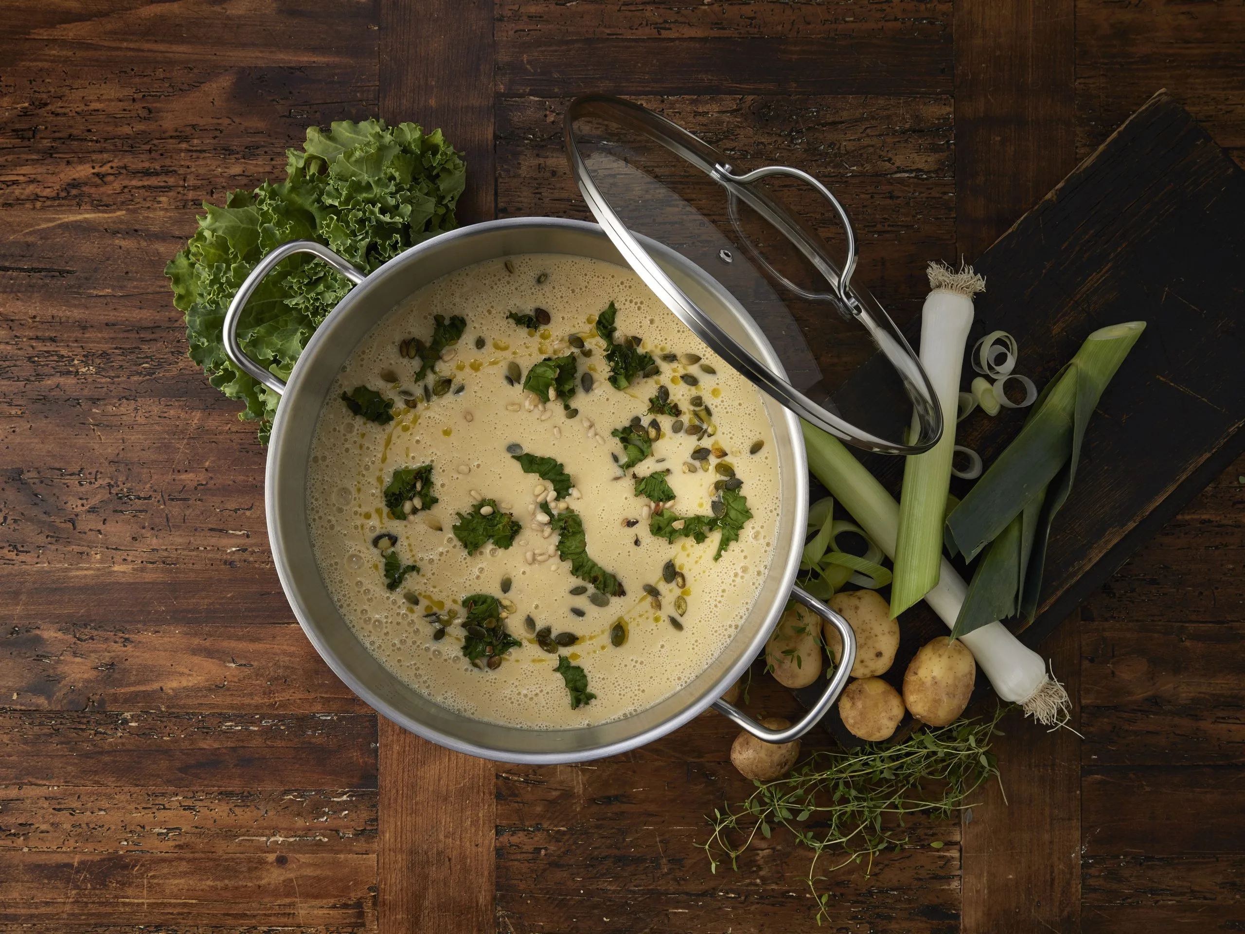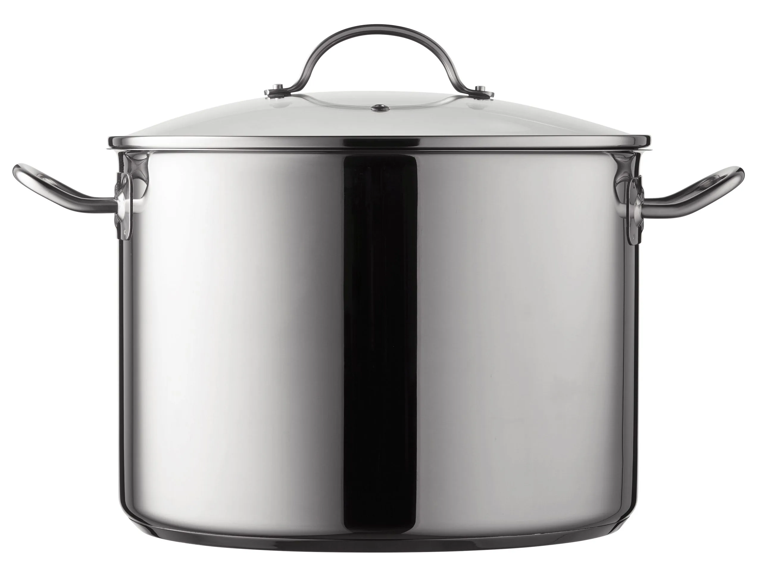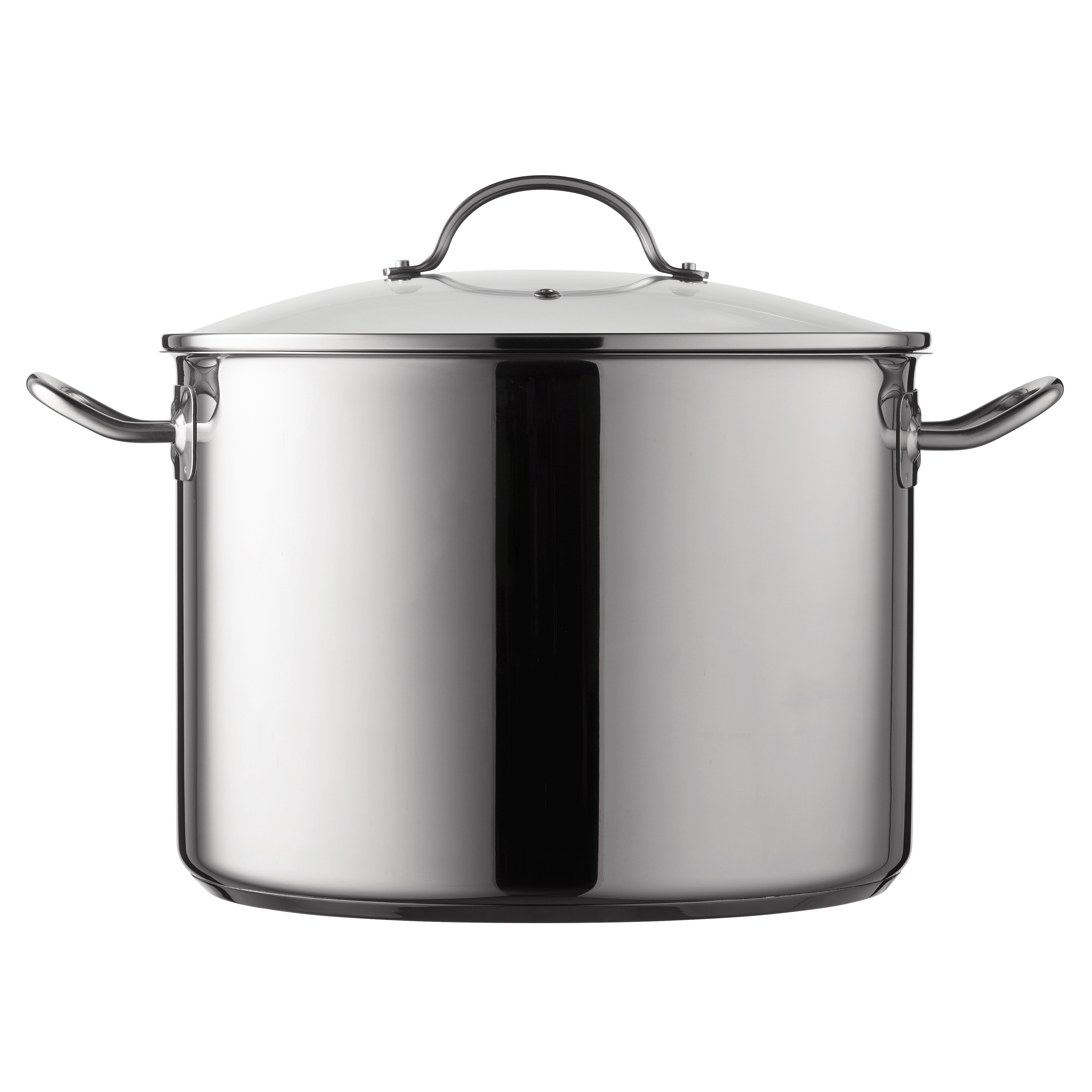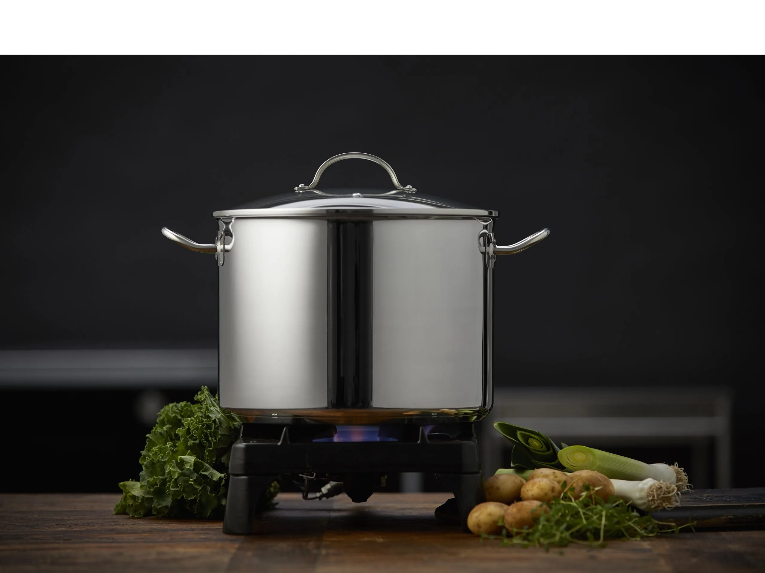 Suppegryde, 12 liter, fremstillet i 18/8 rustfrit stål med kraftig induktionsbund, blankpoleret udvendigt, matpoleret indvendigt og med måleskala.