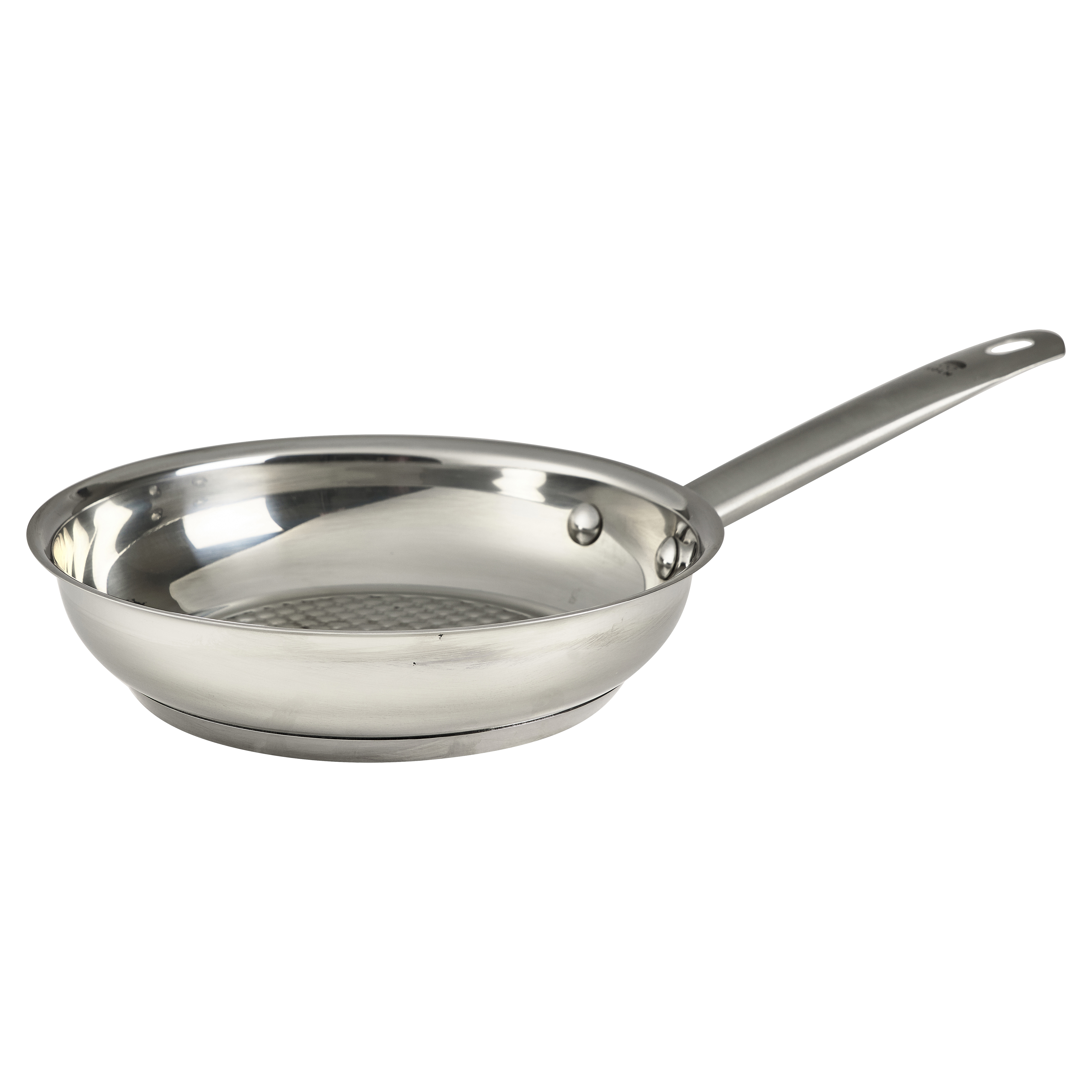 Stegepande, 20 cm, i poleret rustfrit stål med stålhåndtag, 6 mm sandwichbund og honeycomb-overflade. Strukturen på stegefladen betyder, at fedtstoffet lægger sig i fordybningerne, og derved mindskes risikoen for fastbrænding.
