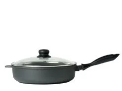 Stegepande, 28 cm, i poleret rustfrit stål med stålhåndtag, 6 mm sandwichbund og honeycomb-overflade. Strukturen på stegefladen betyder, at fedtstoffet lægger sig i fordybningerne, og derved mindskes risikoen for fastbrænding.