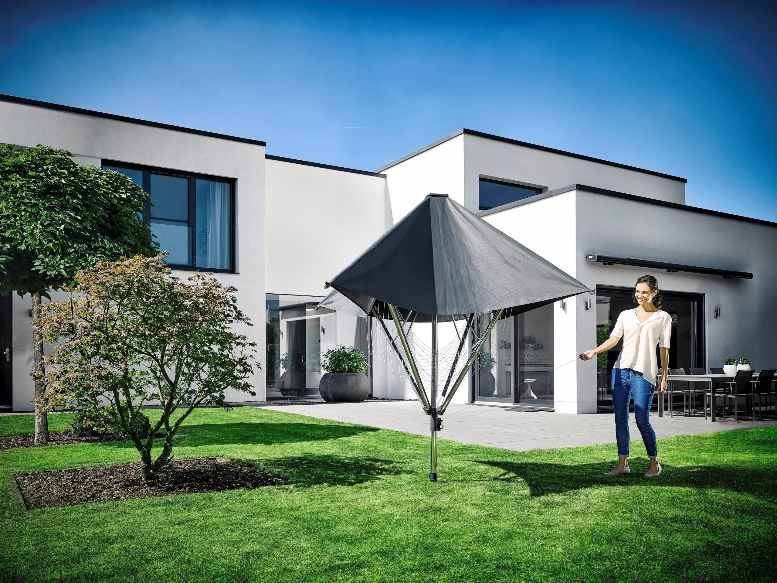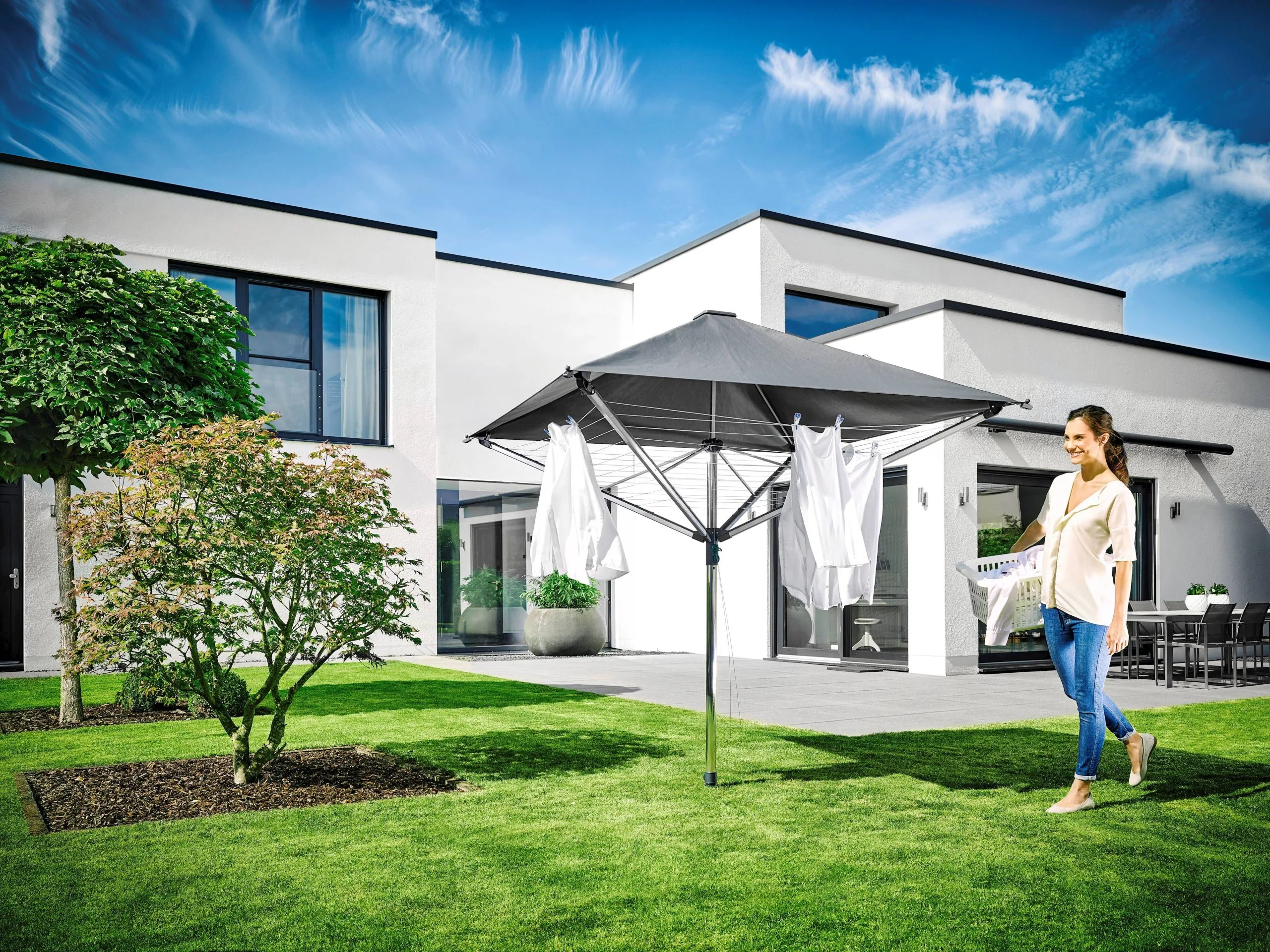 Det nye tørrestativ fra Leifheit, LinoProtect 400, gør det nu muligt at tørre tøj udendørs selvom det regner. LinoProtect er monteret med et tag, som gør, at man kan lade tøjet hænge ude selvom det begynder at regne.