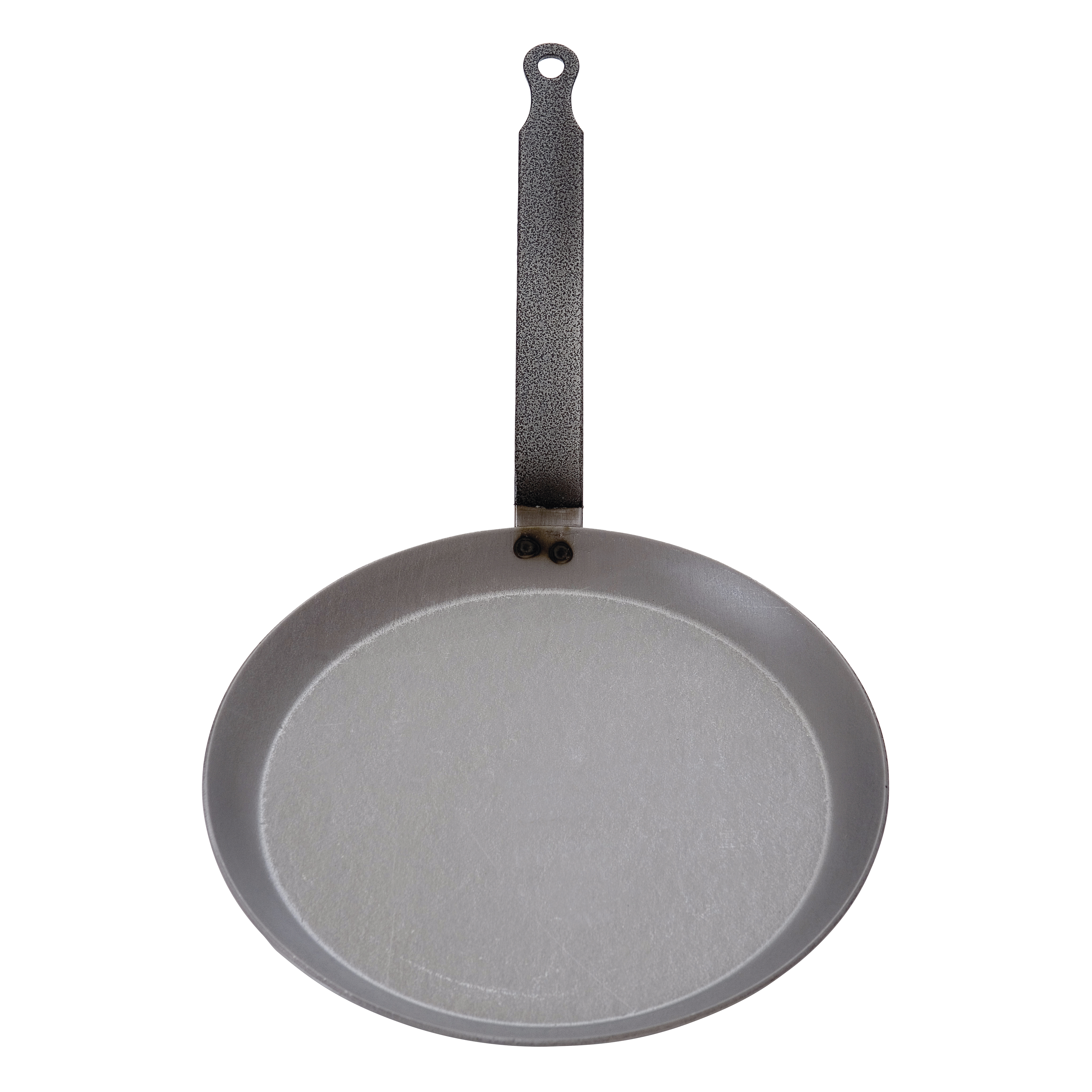 Professionel kvalitet i sort stål, der med tiden får en naturlig non-stick-egenskab. Ekstra tykt sort stål (kulstofstål) på 1,2-3 mm. Håndtag i stål med stålnitter. Fremragende varmeledende egenskaber. Tåler høje temperaturer og metalredskaber. Lettere end støbejern. Made in France.