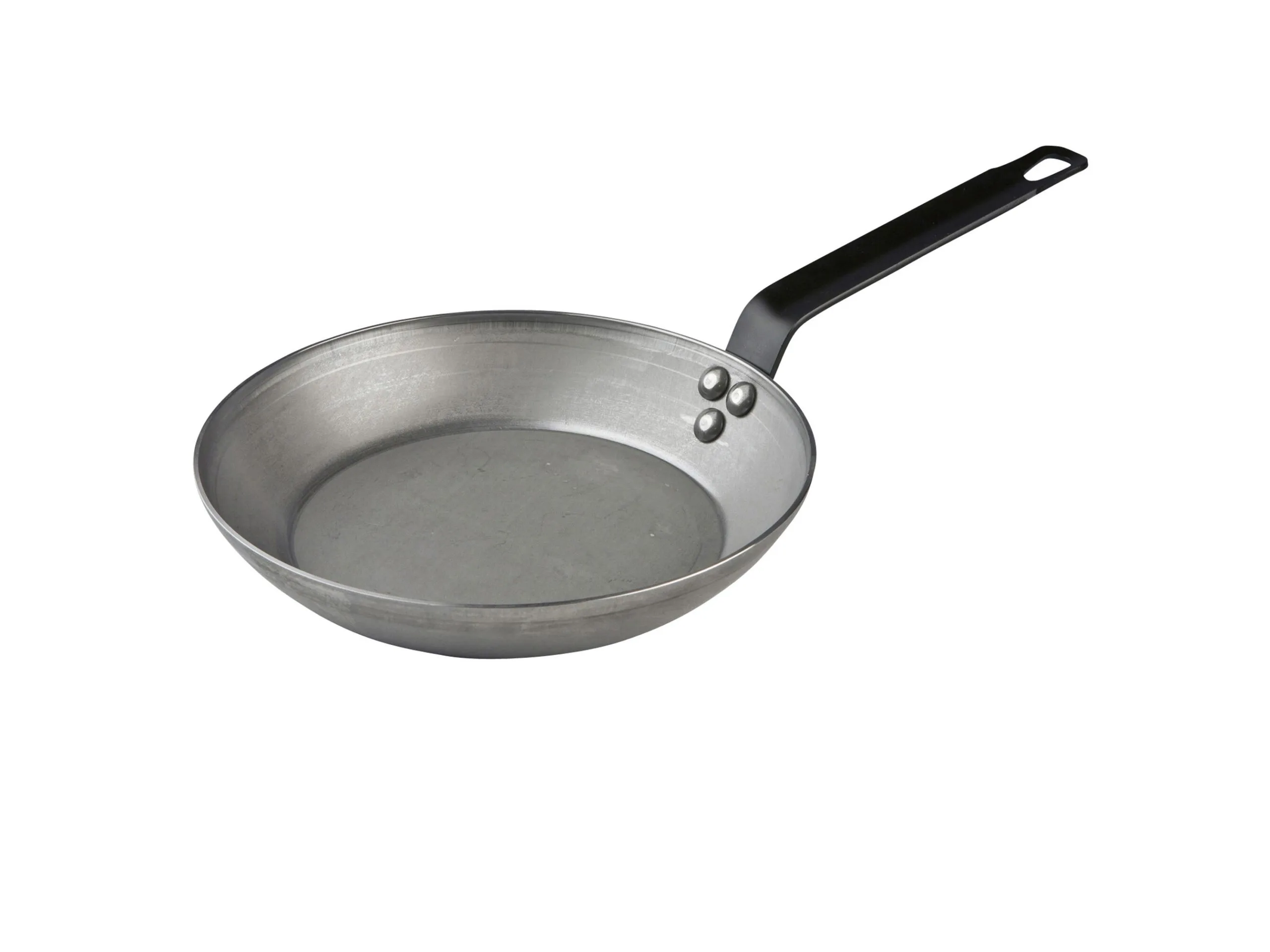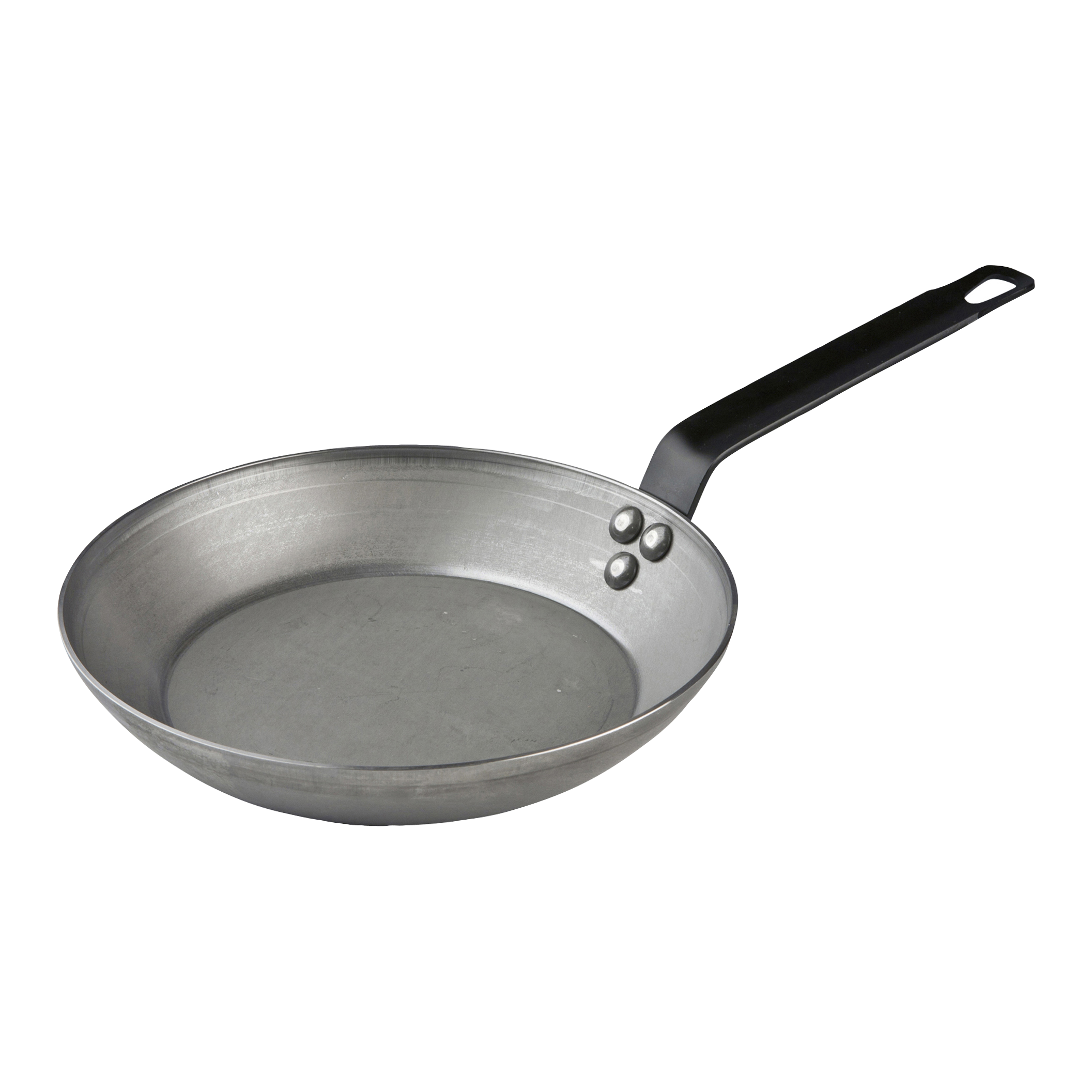 Professionel kvalitet i sort stål, der med tiden får en naturlig non-stick-egenskab. Ekstra tykt sort stål (kulstofstål) på 1,2-3 mm. Håndtag i stål med stålnitter. Fremragende varmeledende egenskaber. Tåler høje temperaturer og metalredskaber. Lettere end støbejern. Made in France.