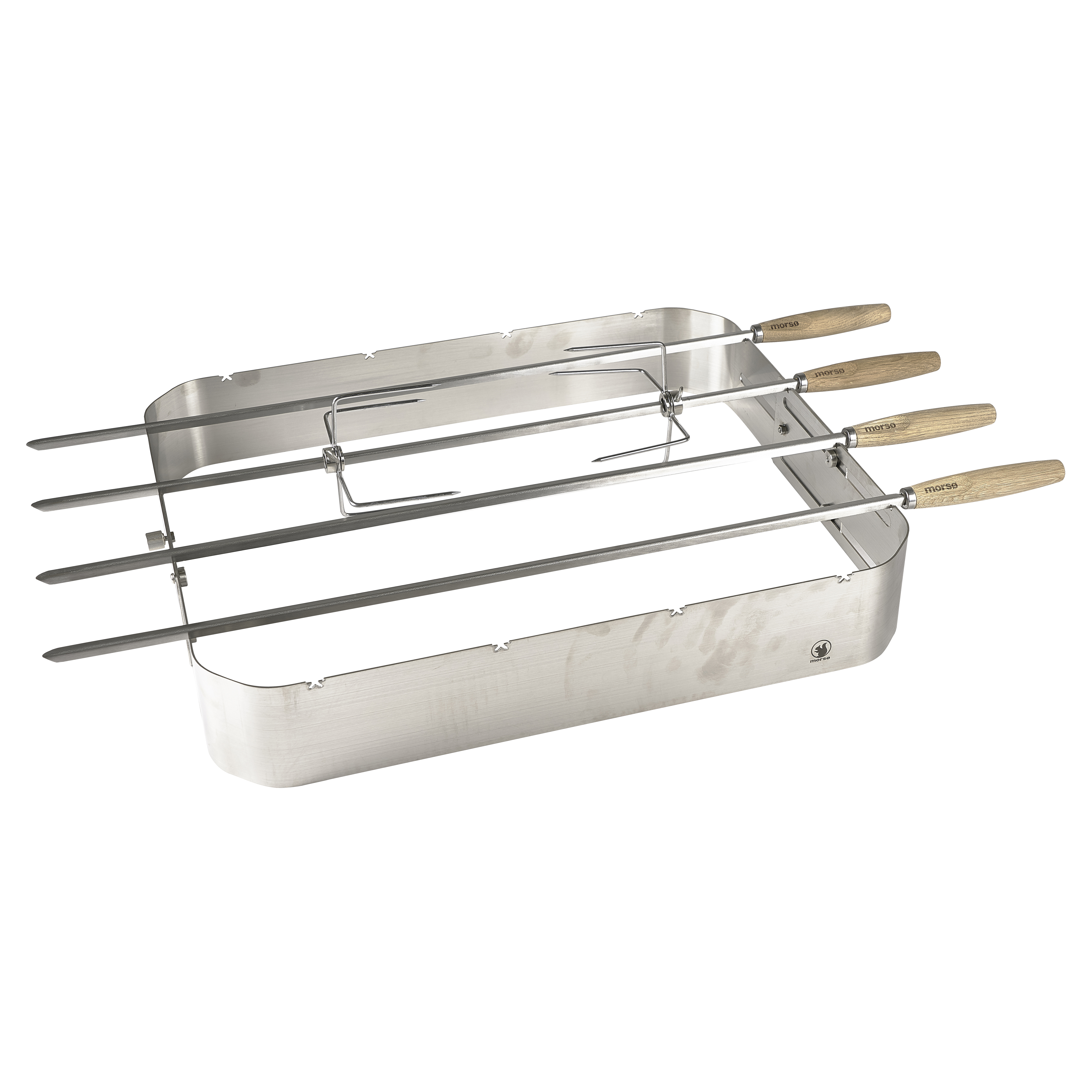 Churrasco til Morsø Grill ’17 og Morsø Forno gør det nemt at tilberede kød, fisk og grøntsager på spyd. Den består af en indstillelig ramme, 4 spyd og 2 gafler i rustfrit stål, som tåler høje temperaturudsving. Spyddene har desuden ergonomisk behagelige greb af olieret egetræ.