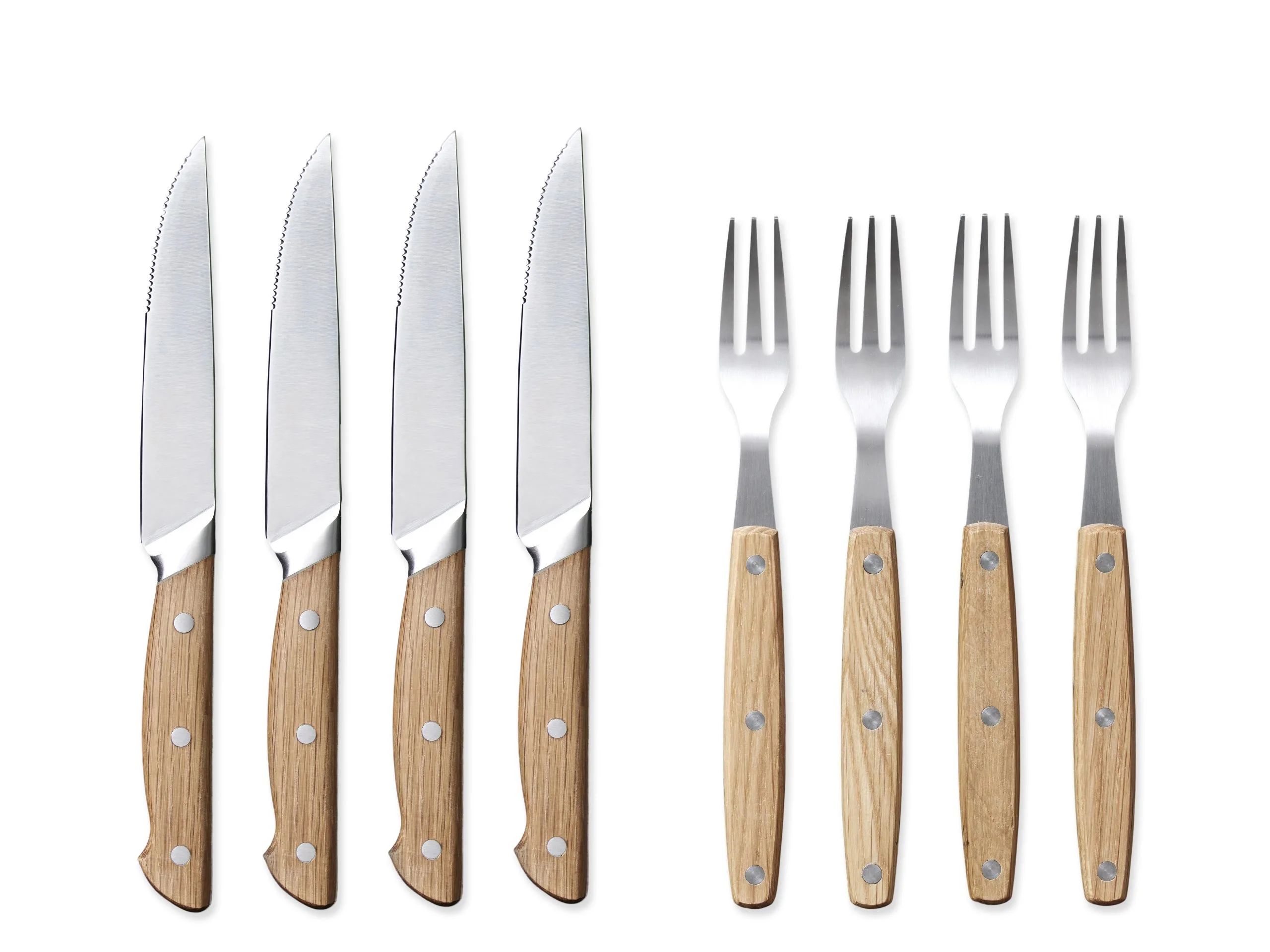 Gaflen og knivbladet er udført i rustfrit kvalitetsstål og håndtagene i olieret eg, som ved brug vil udvikle patina og blot blive smukkere, jo mere bestikket bruges. Træhåndtagene er behagelige at holde om.