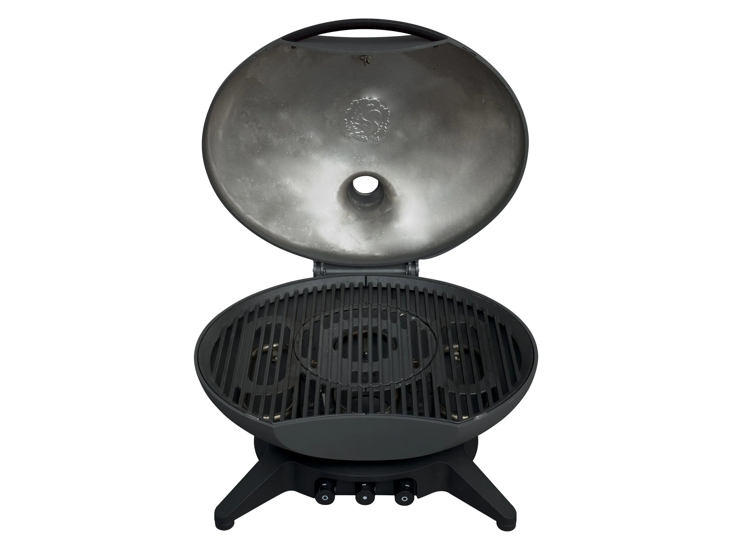 Fremstillet i antracitgråt aluminium og med ellipseformet grillrist i støbejern – grilloverflade 53 x 65,6 cm.