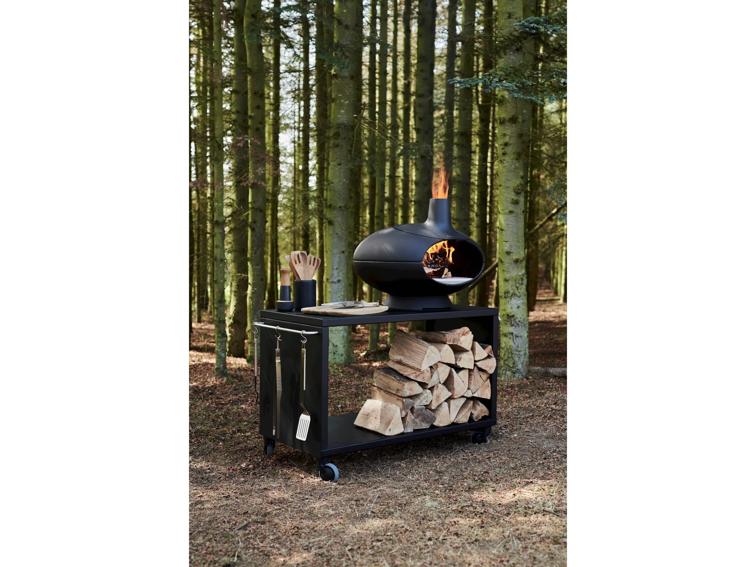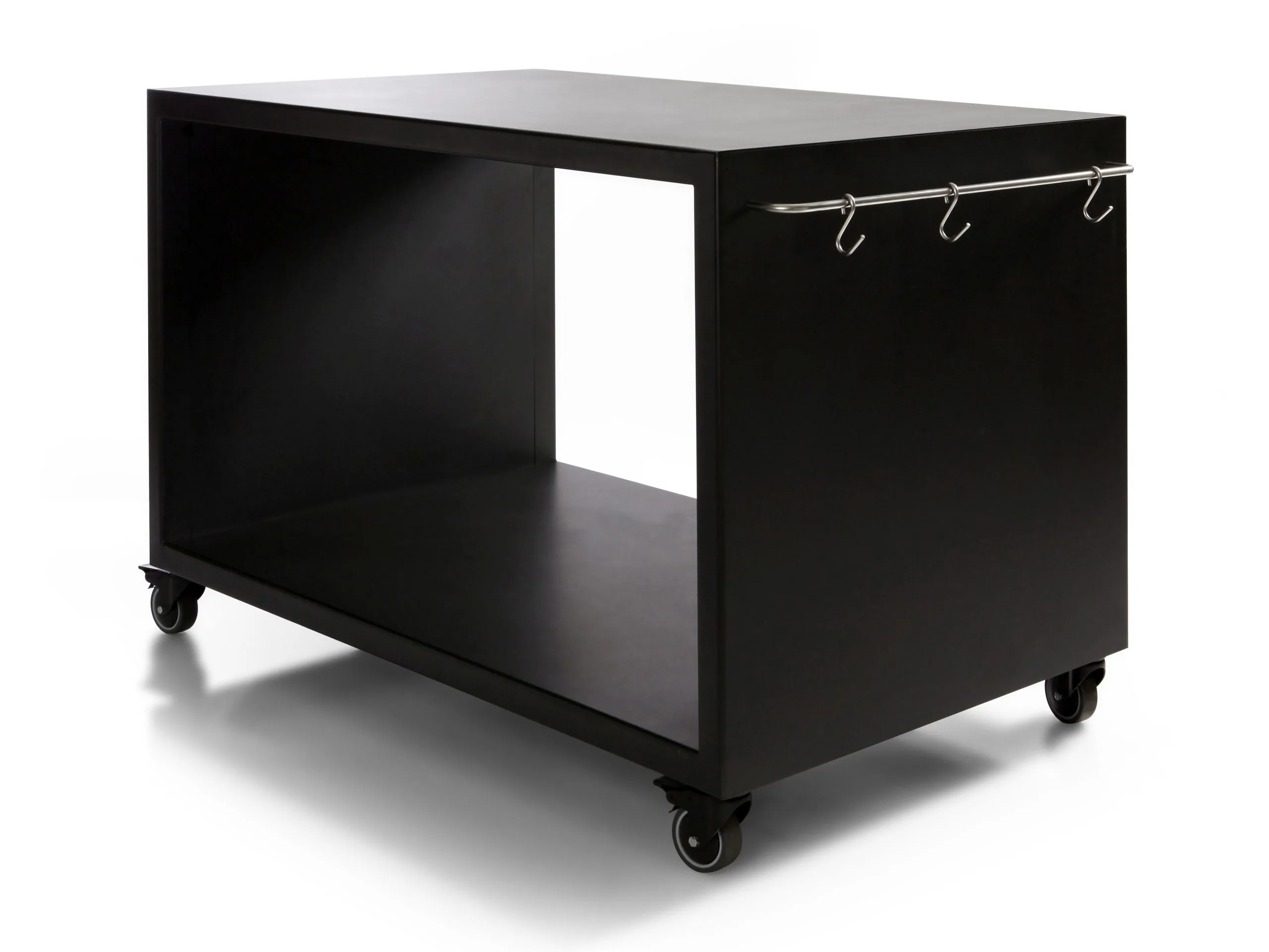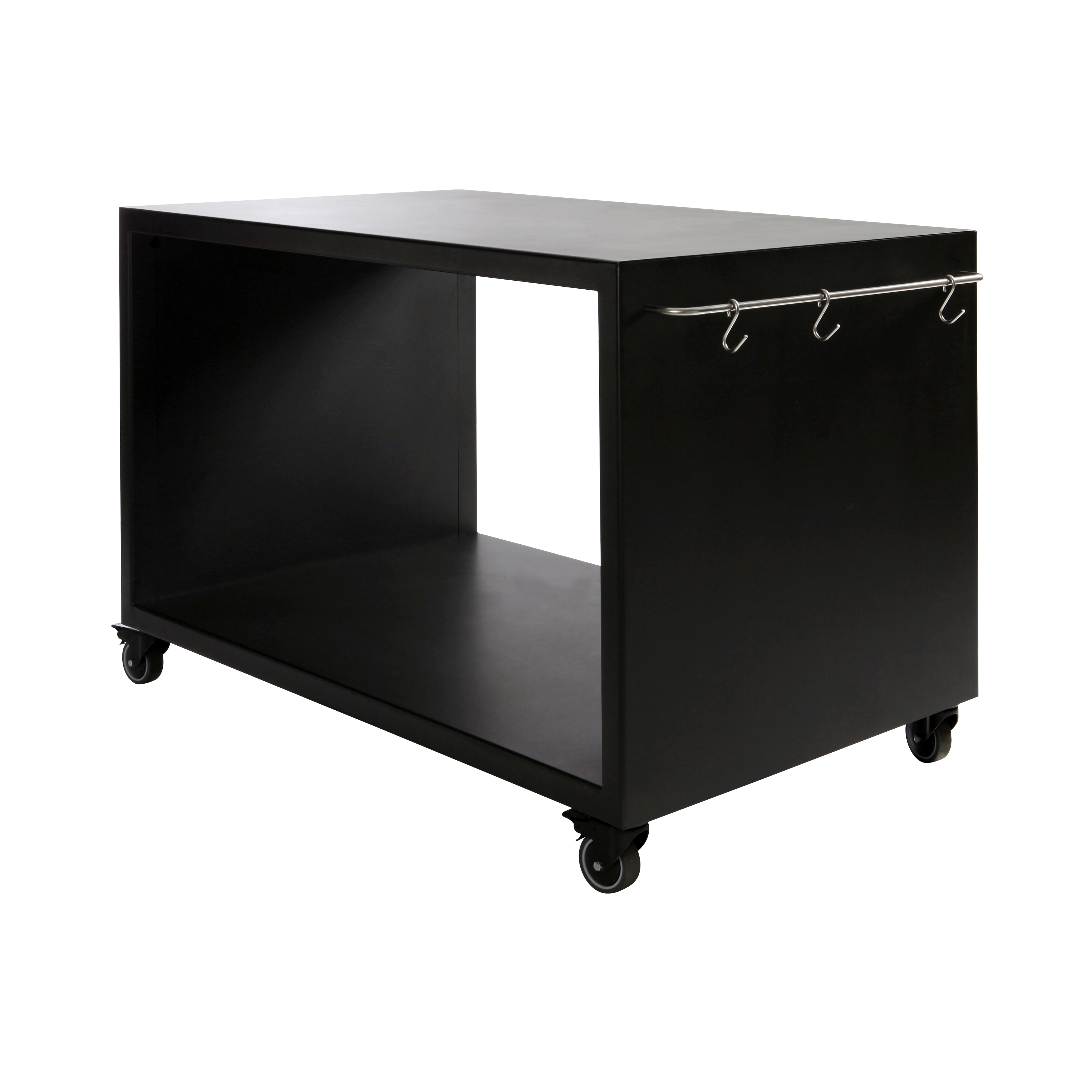 Morsø Garden Udebord 60 x 120 cm. Fremstillet i sort pulverlakeret stål og med håndtag og kroge i rustfrit stål. 4 stk. drejelige hjul m. 2 bremser. Velegnet som bord til udekøkken og placering af Forno. 60 x 80 x 120 cm. 60 kg. Leveres usamlet.