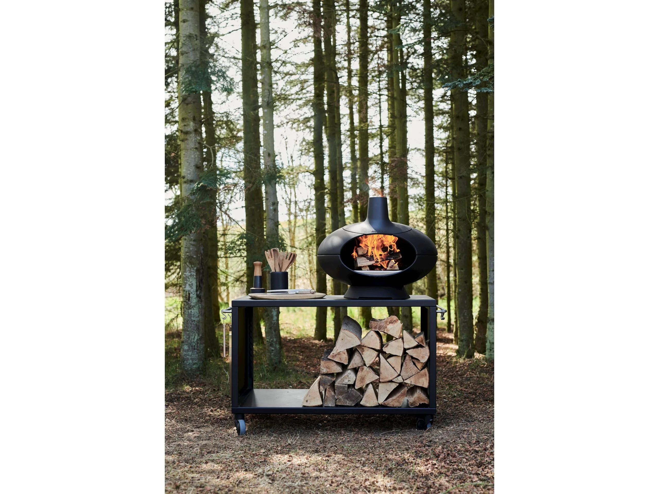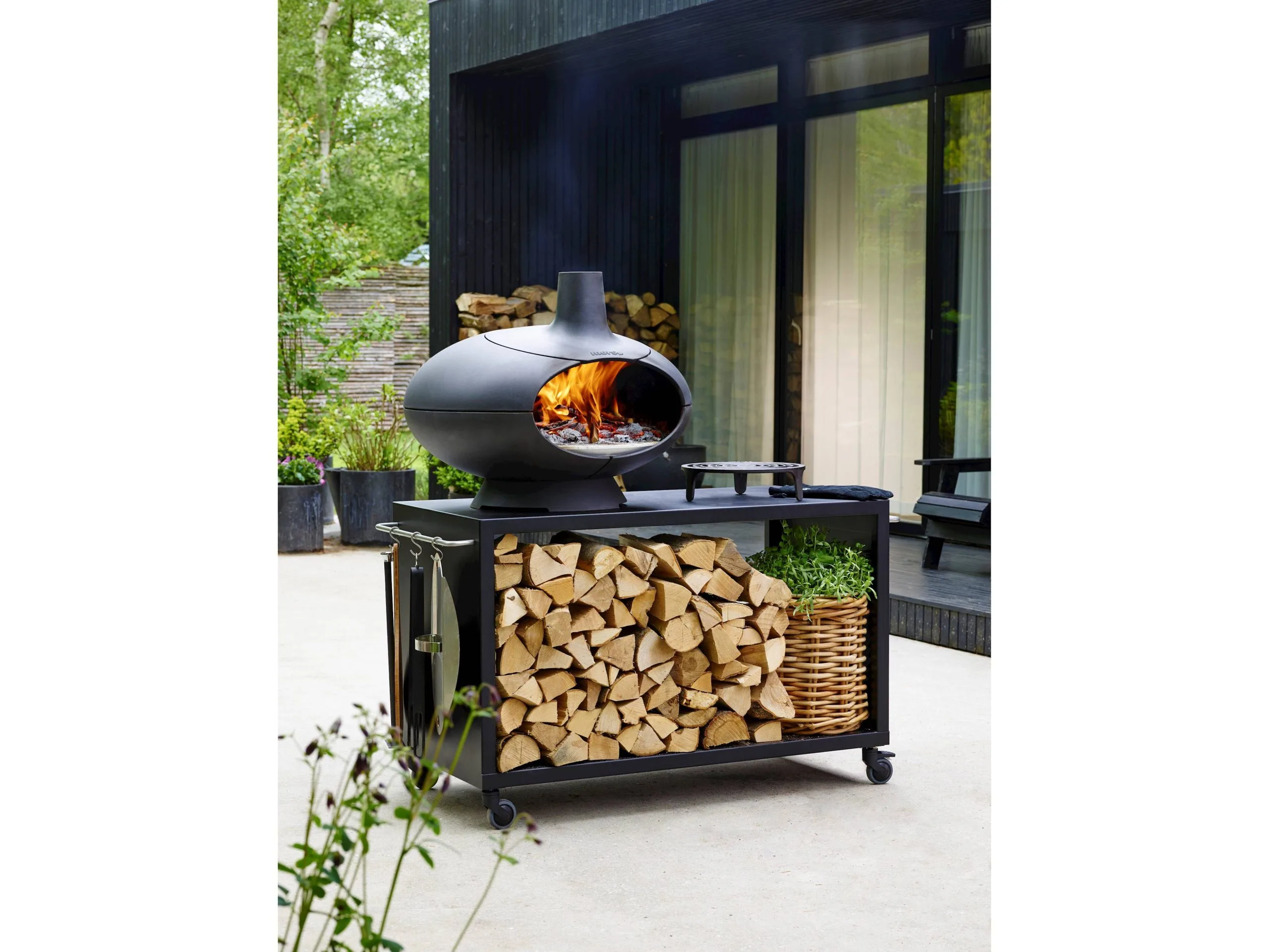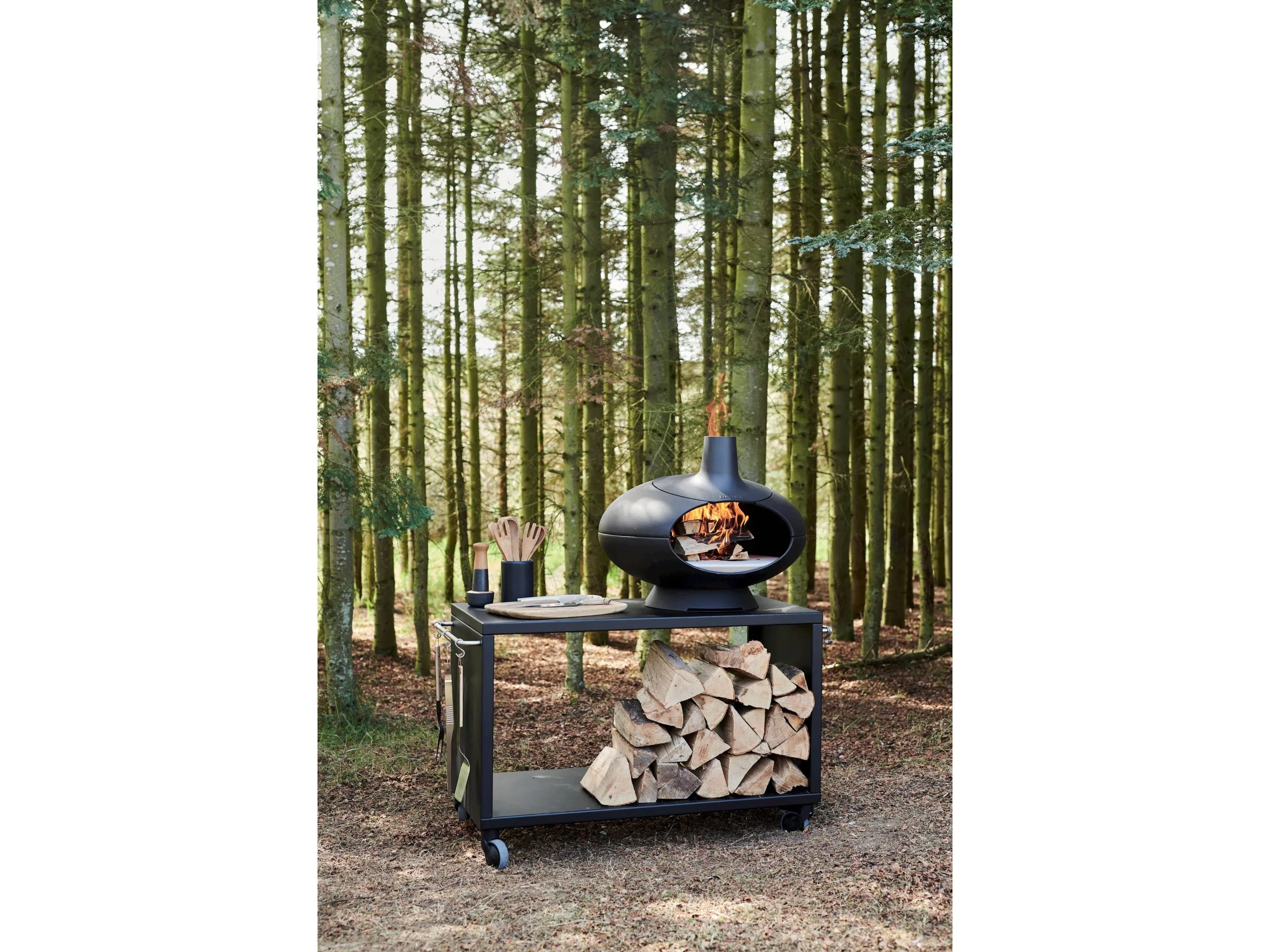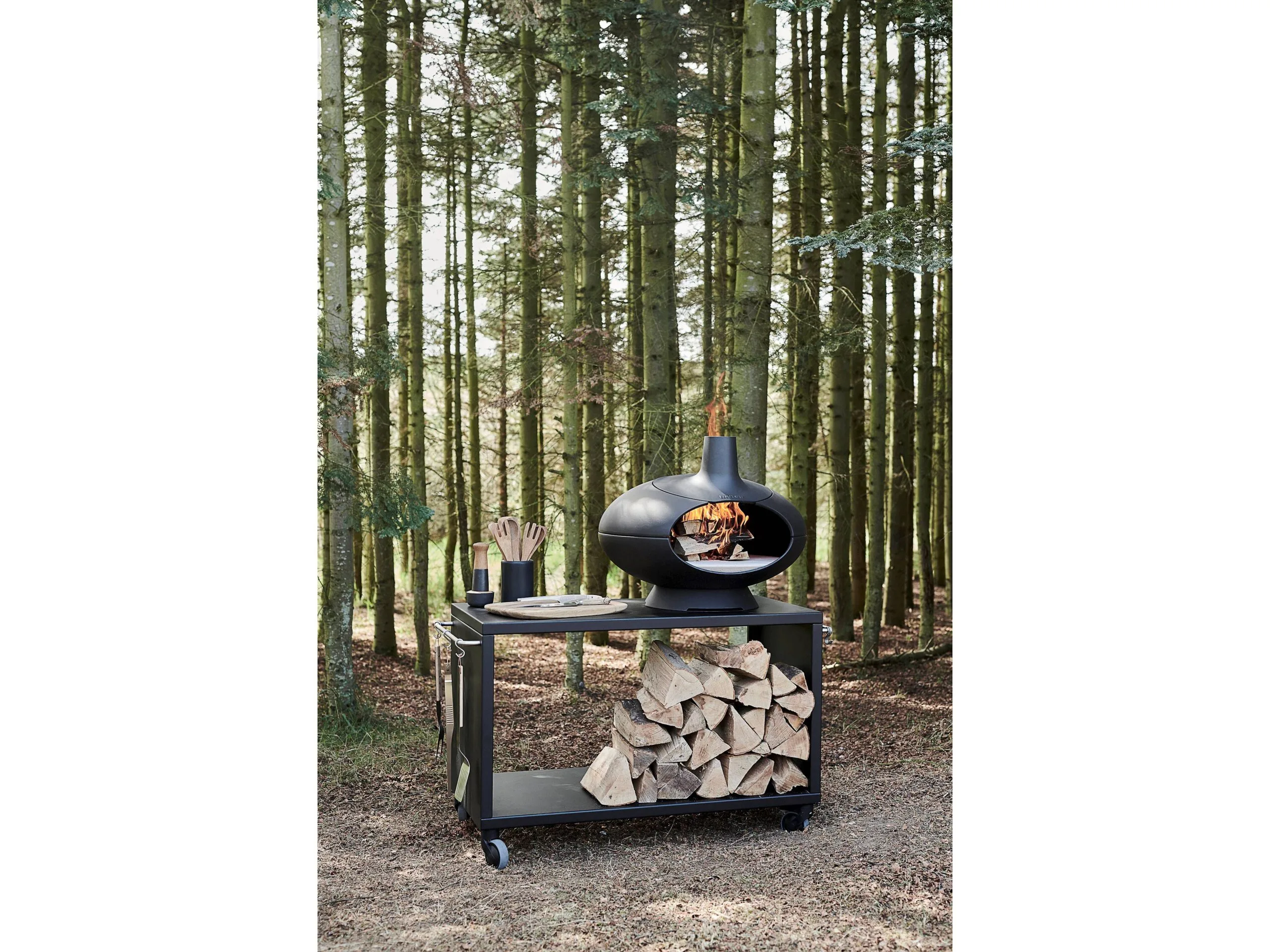 Morsø Garden Udebord 60 x 120 cm. Fremstillet i sort pulverlakeret stål og med håndtag og kroge i rustfrit stål. 4 stk. drejelige hjul m. 2 bremser. Velegnet som bord til udekøkken og placering af Forno. 60 x 80 x 120 cm. 60 kg. Leveres usamlet.