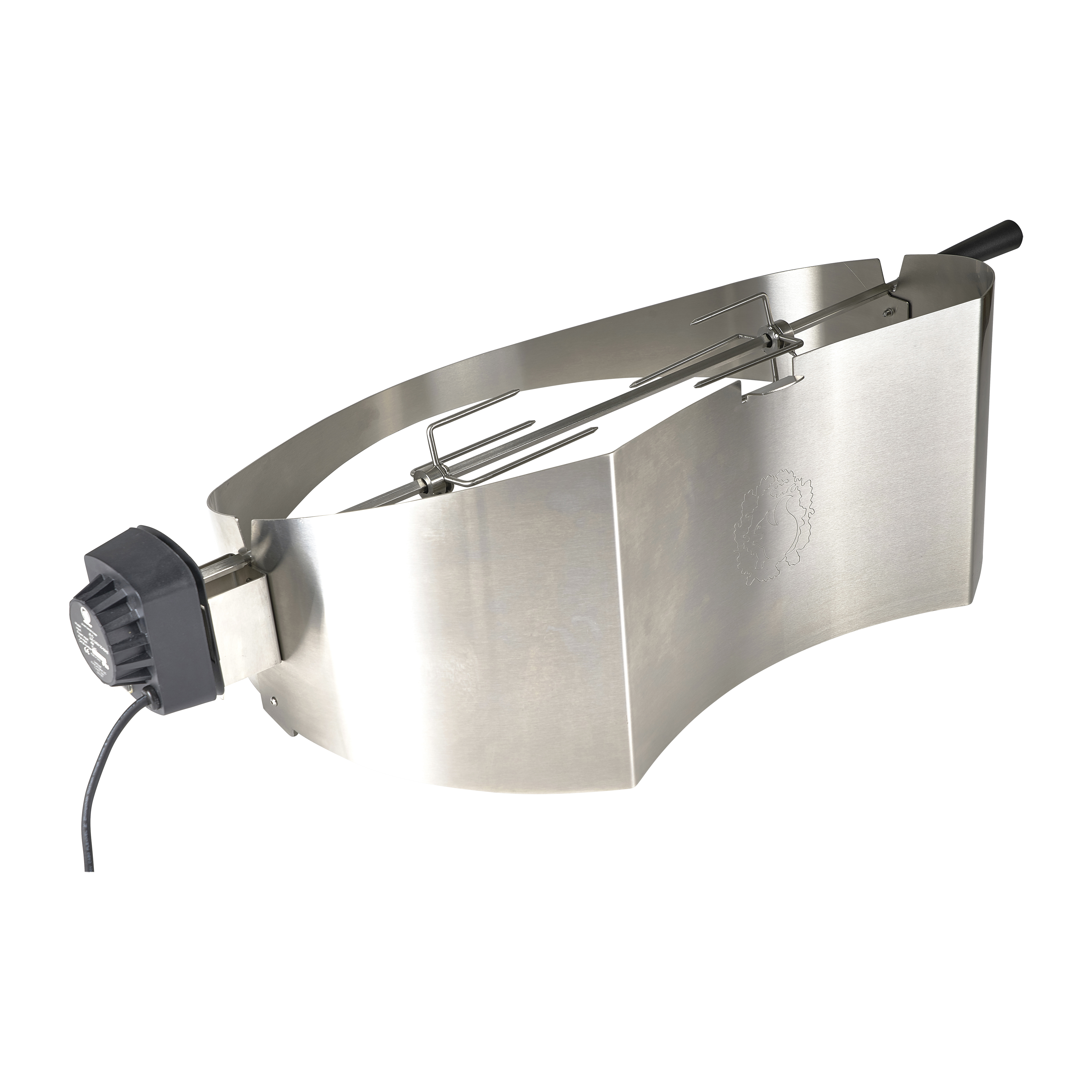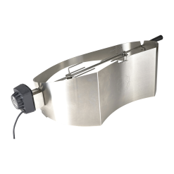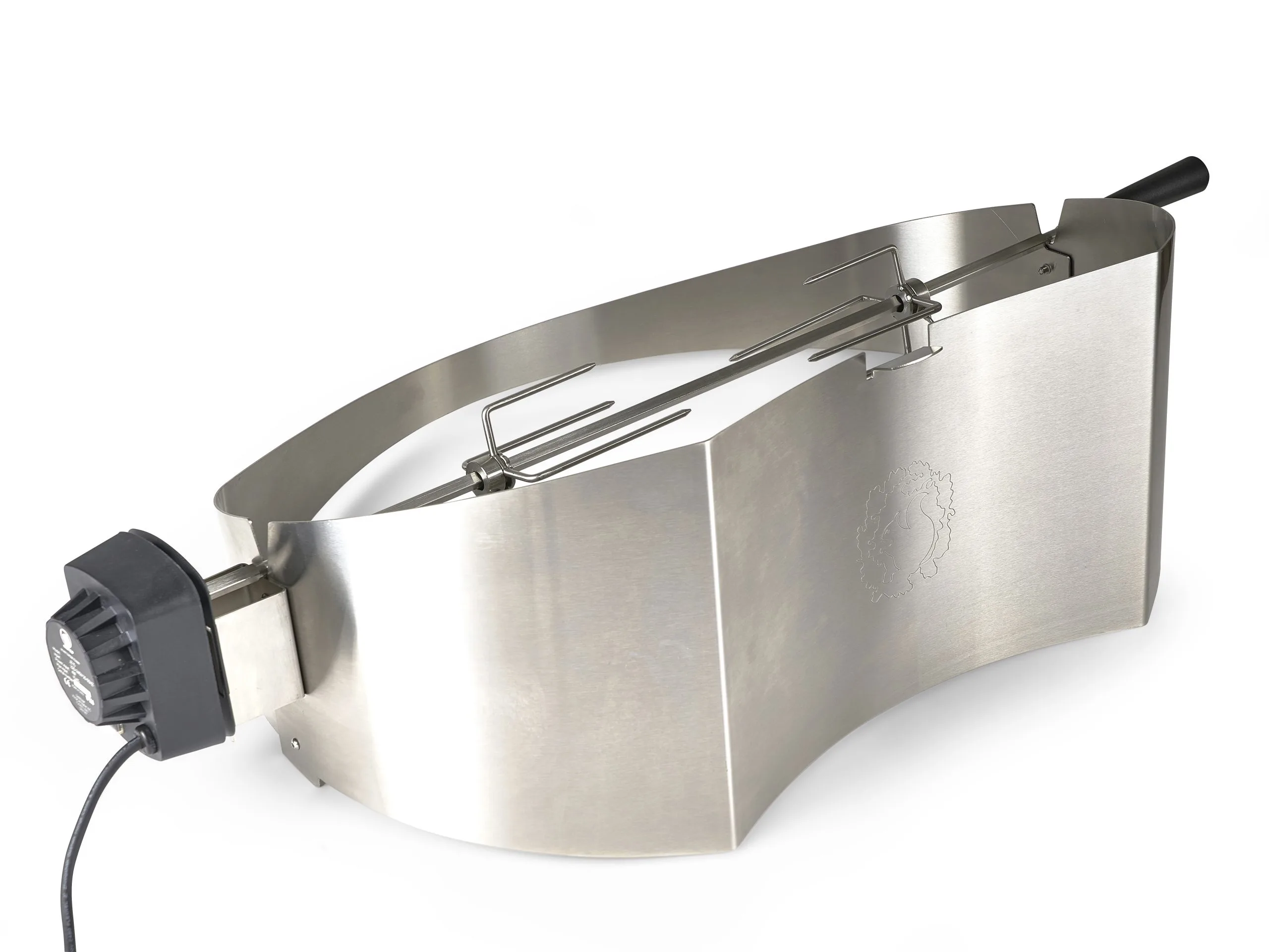 Funktionelt rotisserie til Morsøs populære Forno Gas Grande. Den smukt buede skærm i rustfrit stål kiler sig elegant ind under grillens låg og skaber derved god plads til at rotere selv store mængder, og der er plads til en saftopsamler mellem spyd og grilllegeme.