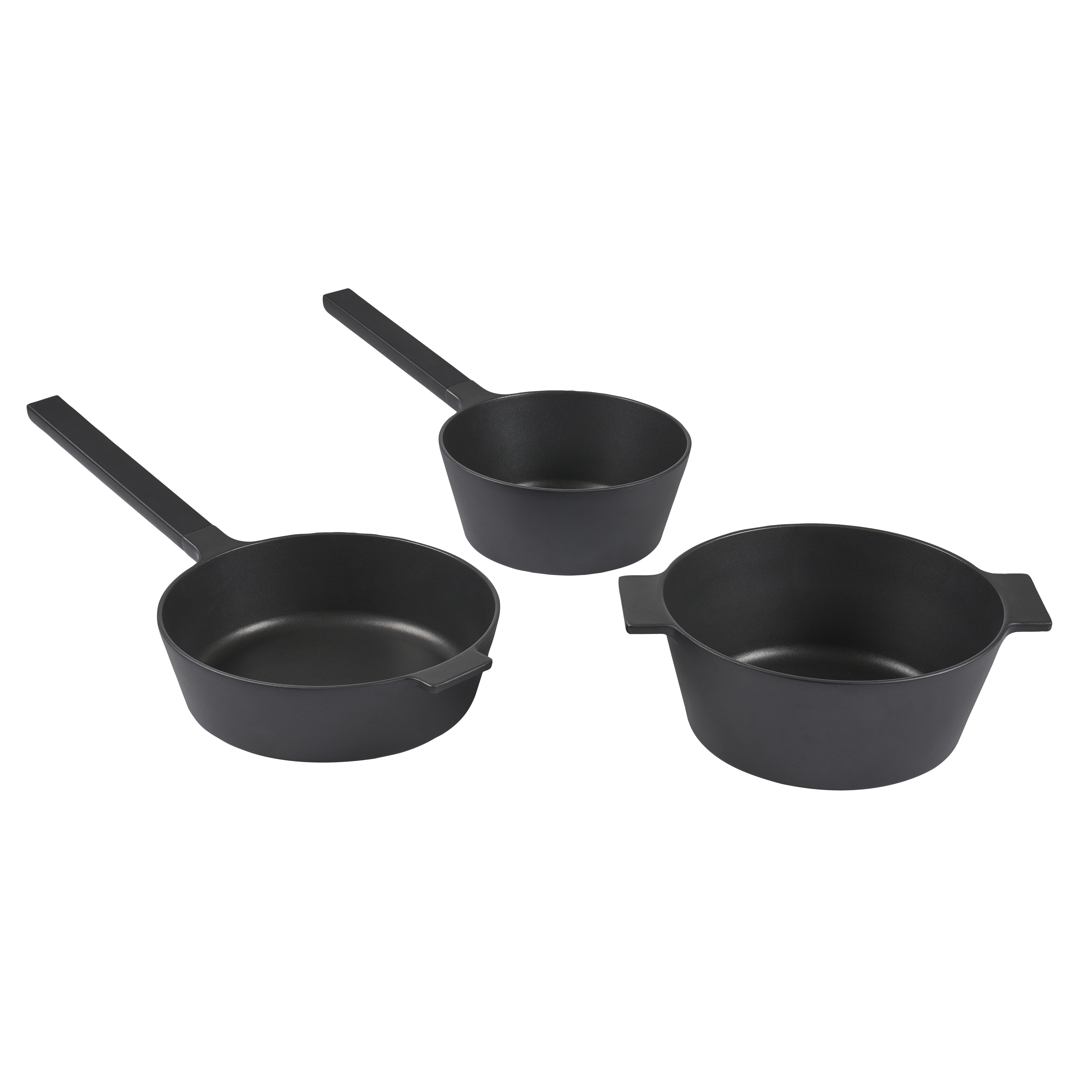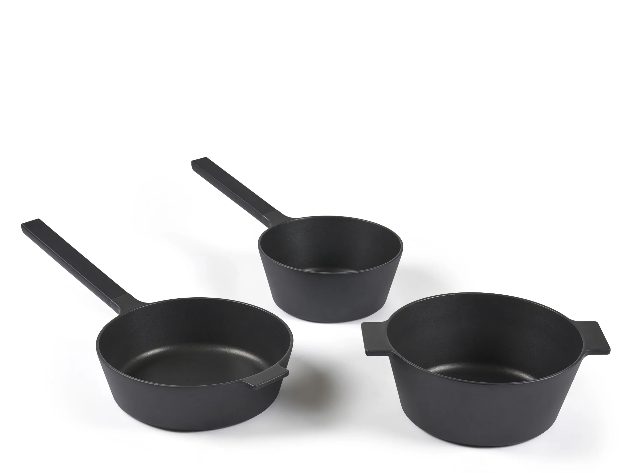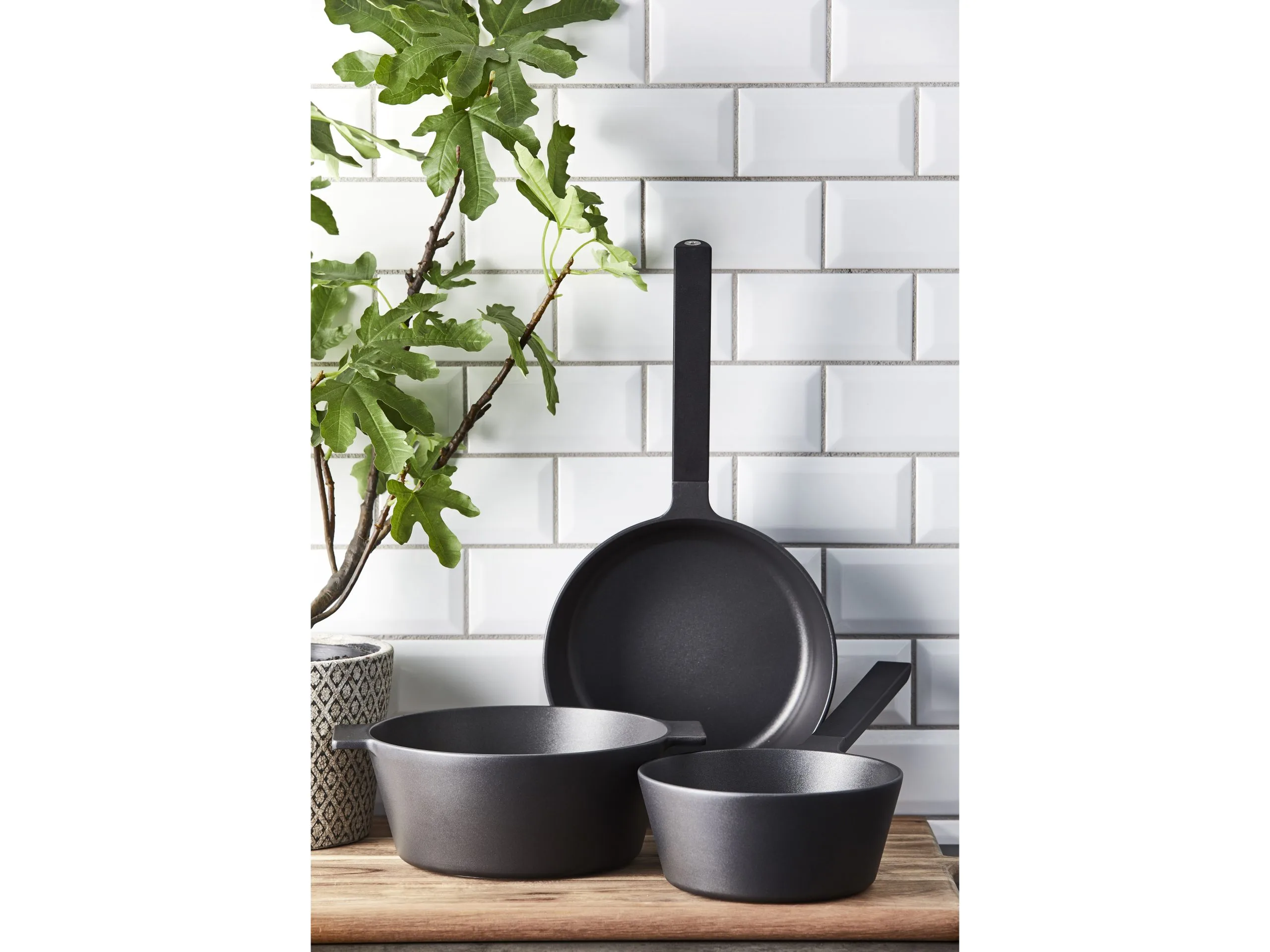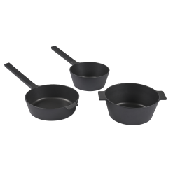 Gryde-/pandesæt fremstillet i støbt aluminium. Kasserolle 1,8 l, Gryde 3,4 l og Sauterpande 24 cm. Panden har høj kant og håndtag i bakelit ligesom kasserollen. Indvendig 3-lags non-stick-belægning, der mindsker risikoen for, at maden brænder fast, og beskyttende udvendig coating, der letter rengøringen. Der kan købes glaslåg, som passer til.