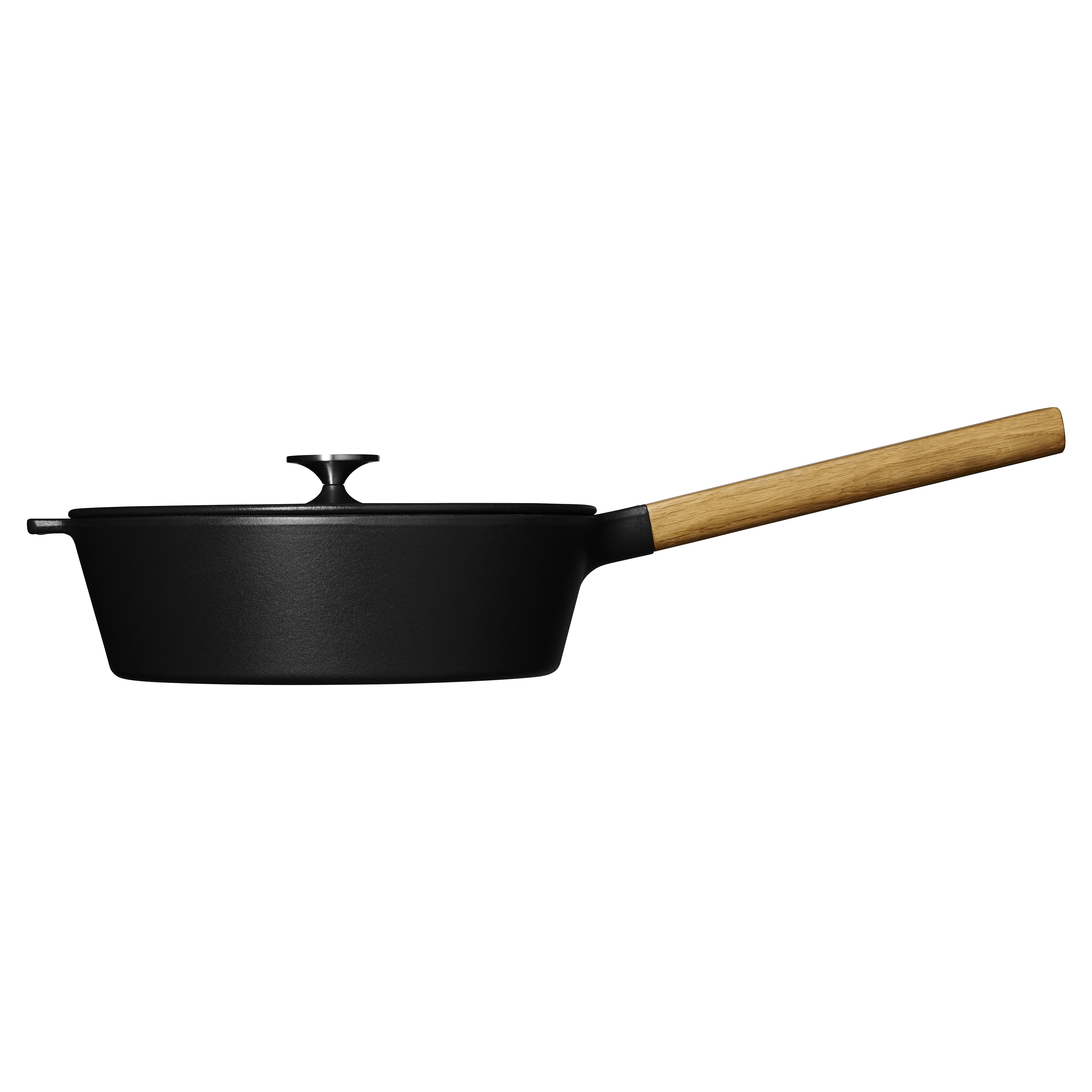 Morsø NAC Sauterpande 25 cm. Fremstillet i sortemaljeret støbejern, knop i rustfrit stål og med greb i olieret eg. 5,5 mm bund sikrer en god og ensartet varmefordeling. Velegnet til alle varmekilder. Ikke egnet i ovn og grill. 25 x 7,5 cm. 2,2 l.