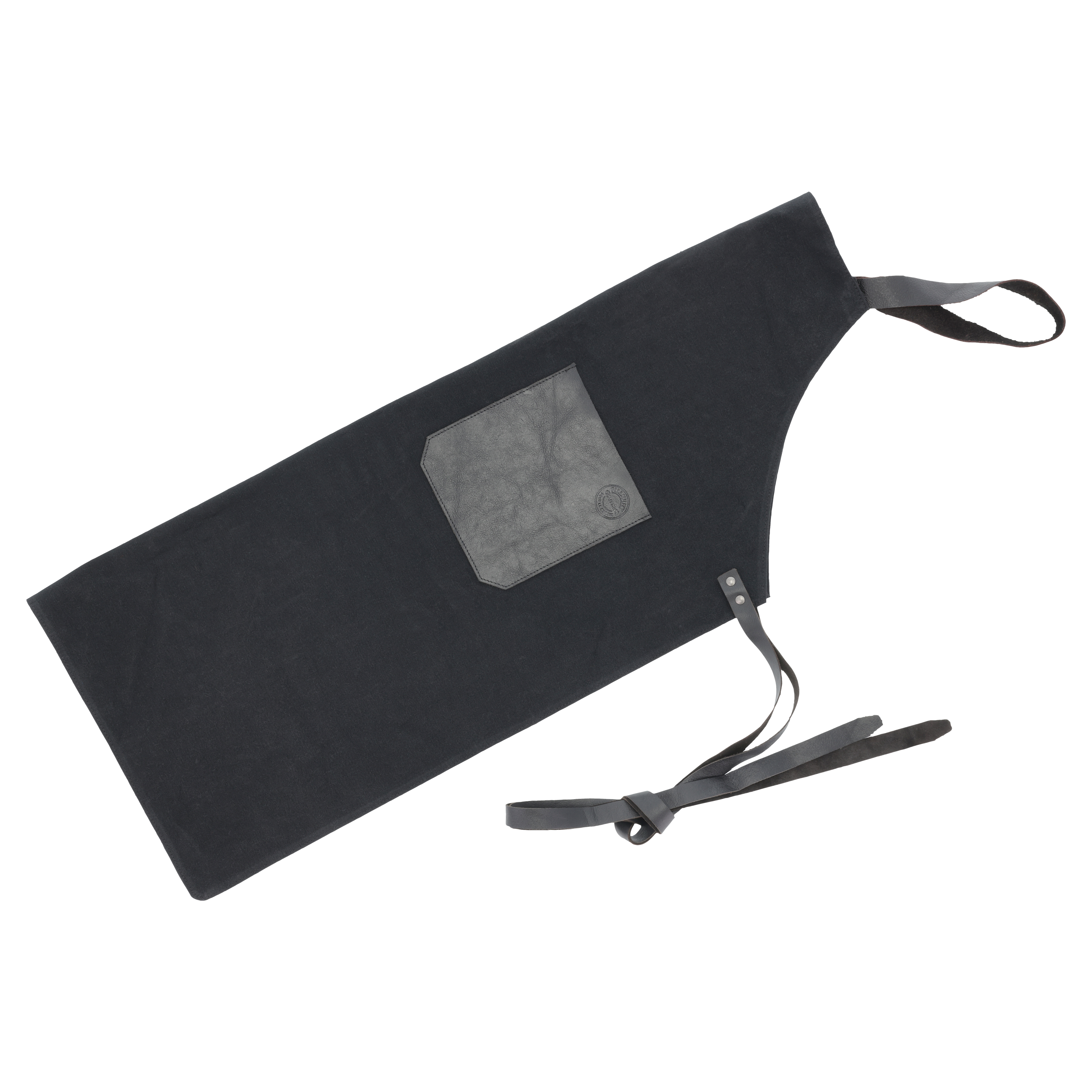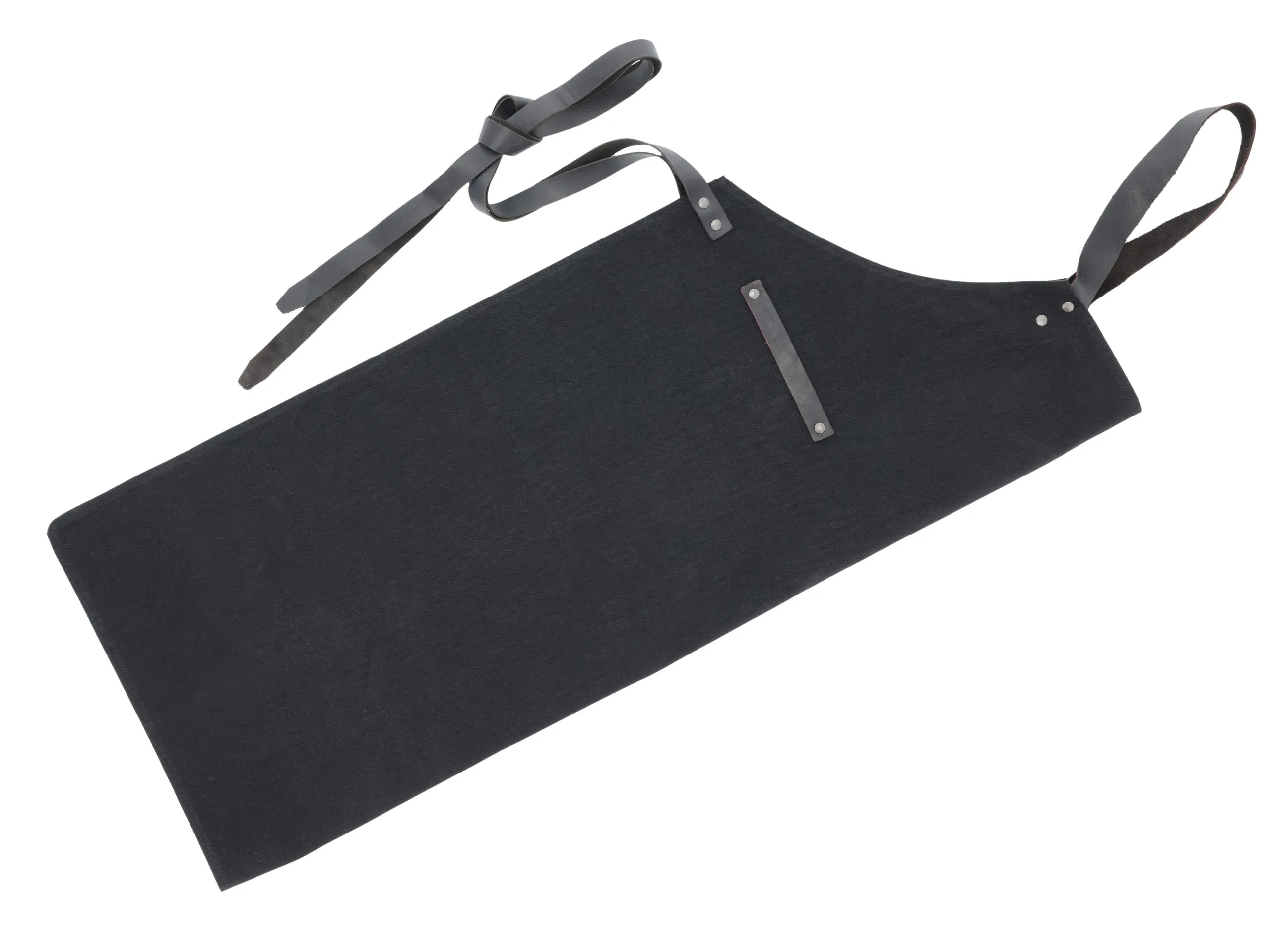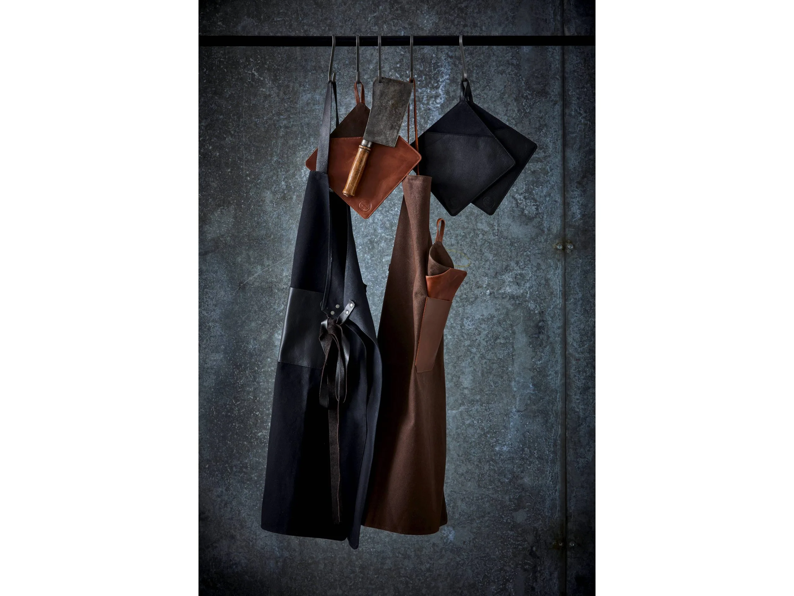 Sort kvalitetsforklæde i vokset kanvas med læderdetaljer. Kanvas er 100 % bomuldsstof i en kraftig vævning. Det er slidstærkt og vandafvisende, hvilket gør det egnet til hverdagsbrug. Det kan let rengøres med en fugtig klud. Læderet er 100 % bøffellæder. Bøffellæder er slidstærkt og har stor elasticitet. Med passende pleje vil bøffellæder holde i lang tid og få patina, som fremhæver læderets skønhed. Forklædet har en praktisk lomme og en strop, hvor viskestykket kan hænge, imens du laver mad. Forklædet kan justeres, så det passer til din højde.