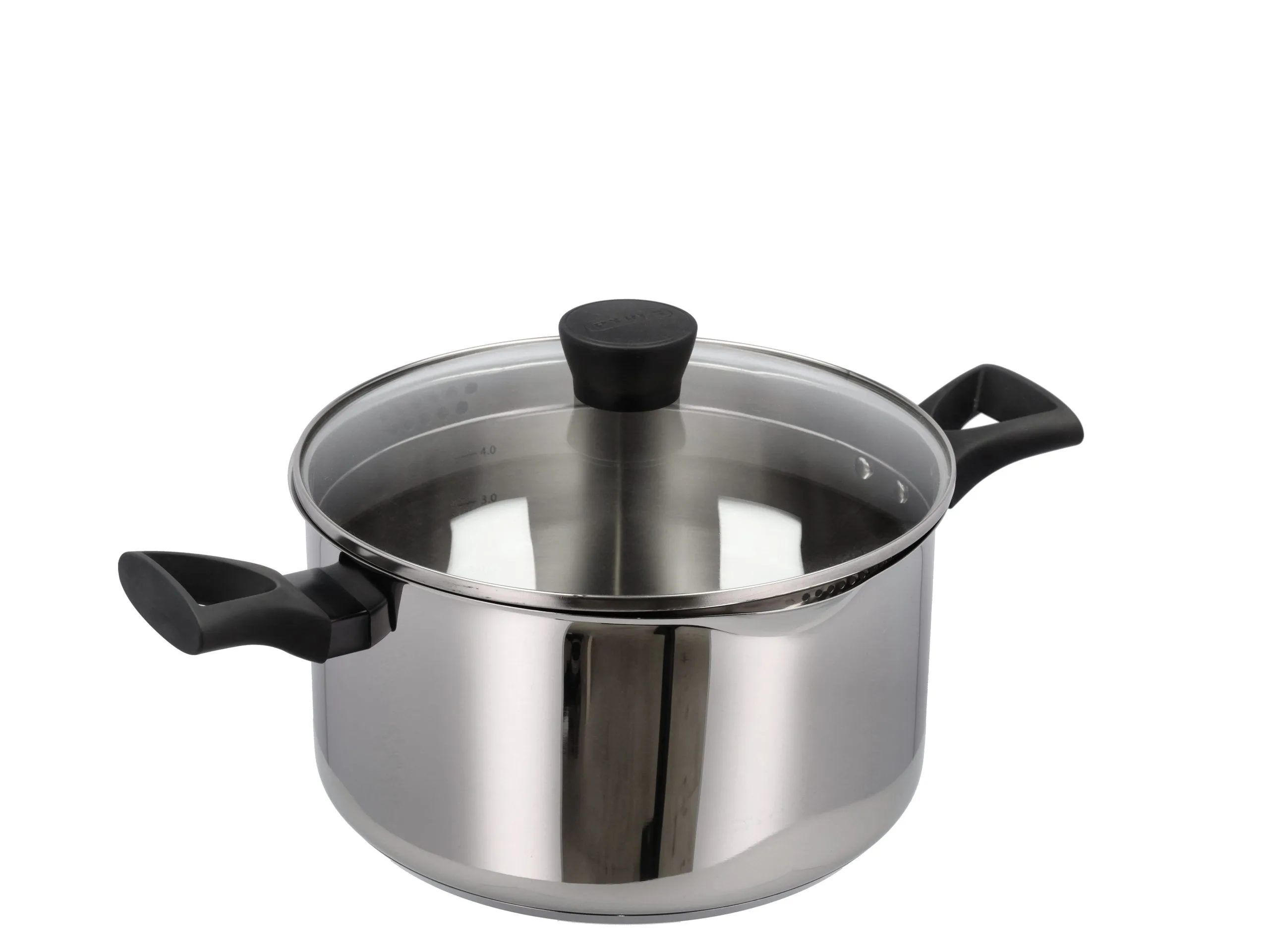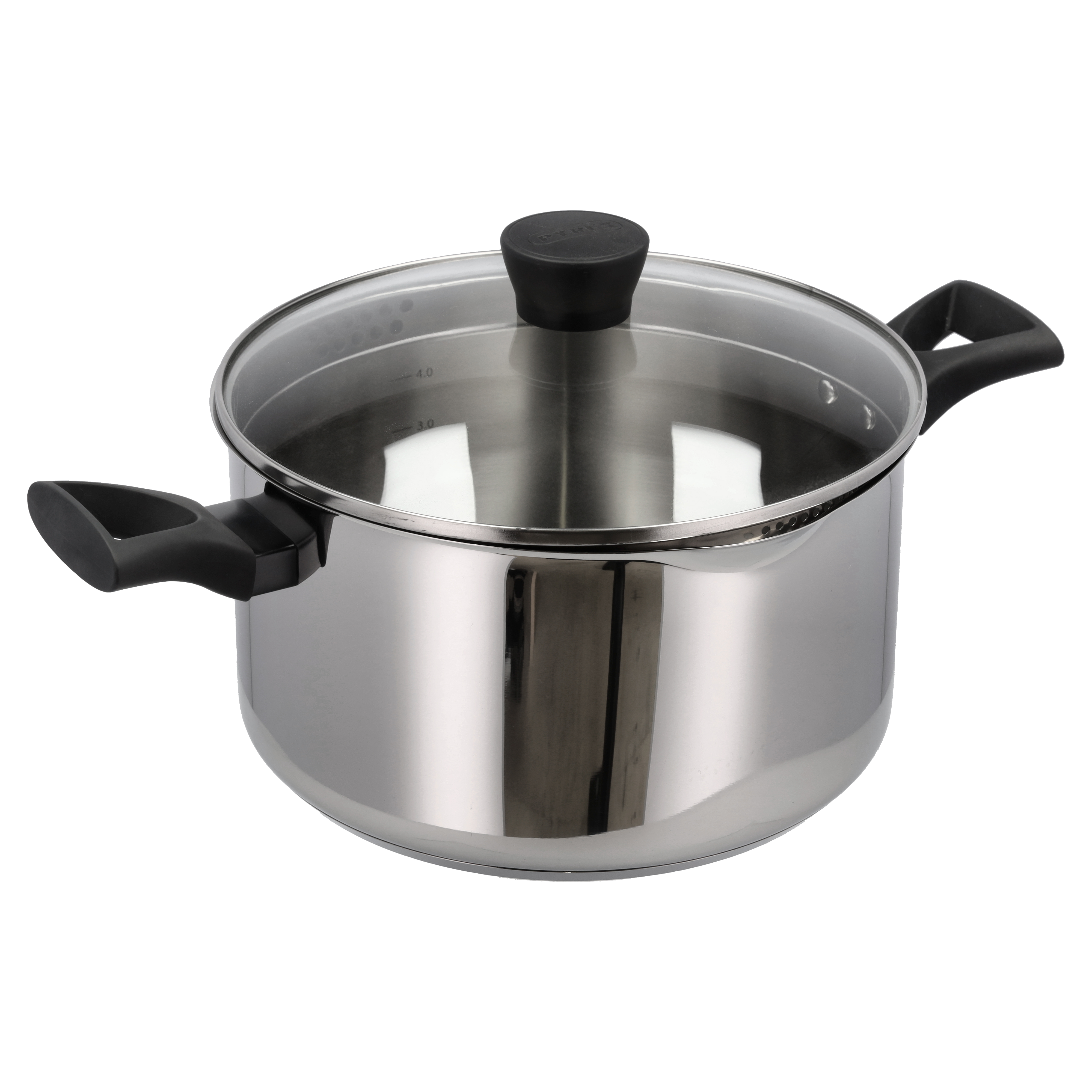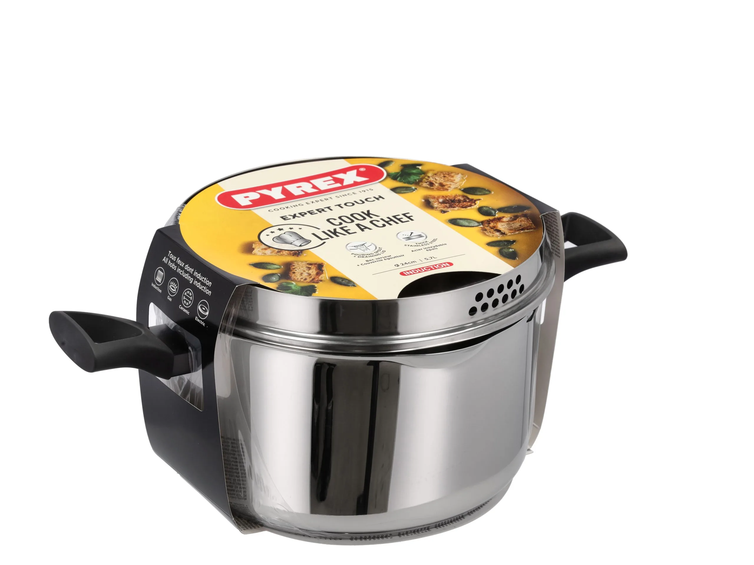 Expert Touch gryde, 5,7 liter, i rustfrit stål med non-stick belægning og et håndtag, der ligger godt i hånden. Praktisk hældetud og et glaslåg med si-funktion, der gør det nemt at hælde vandet fra gryden. Velegnet til induktion, gas, el og keramiske kogeplader. 10 års garanti.