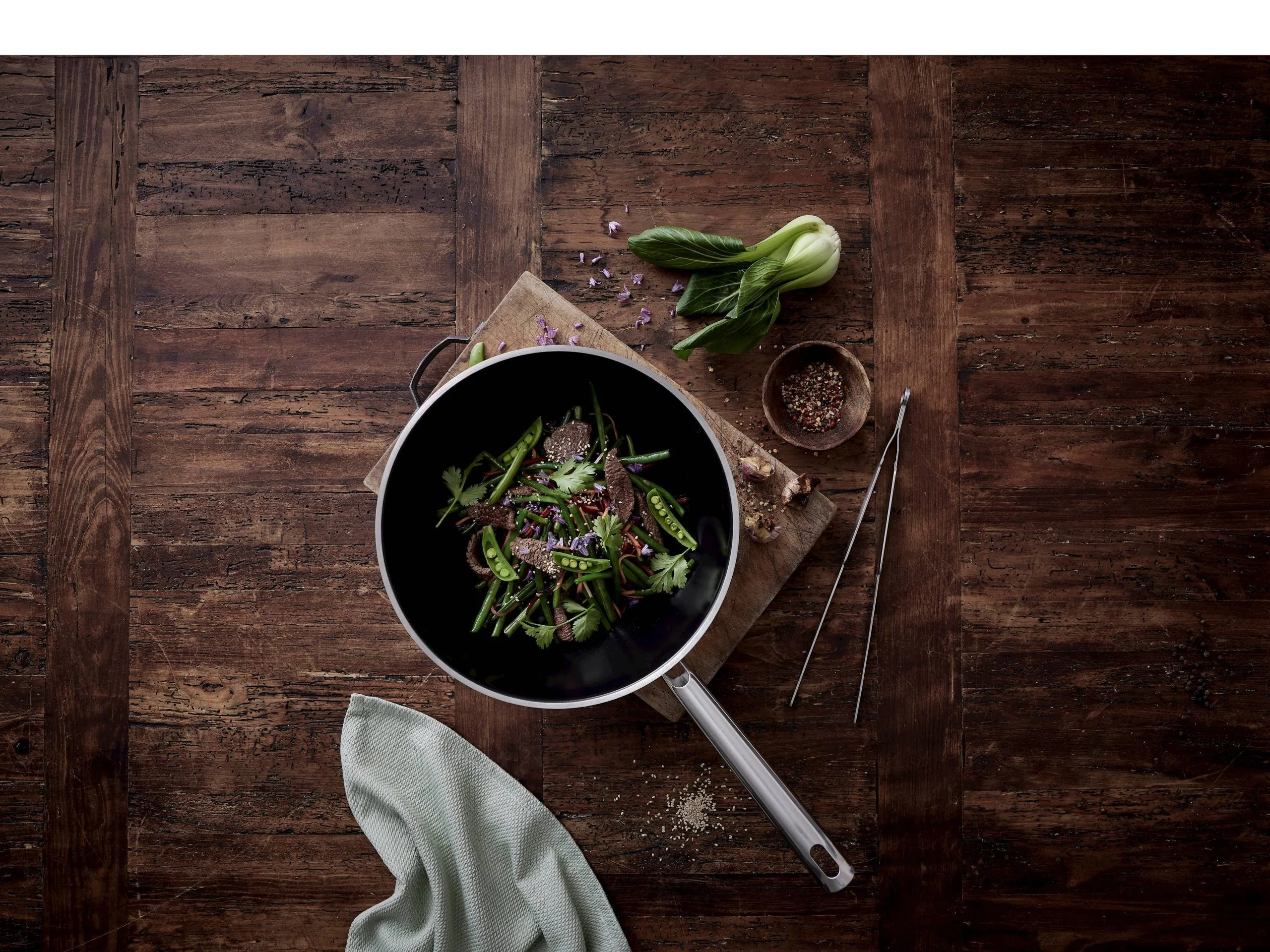 Wok med 5 mm tykt multilag fordeler varmen hurtigt og ensartet