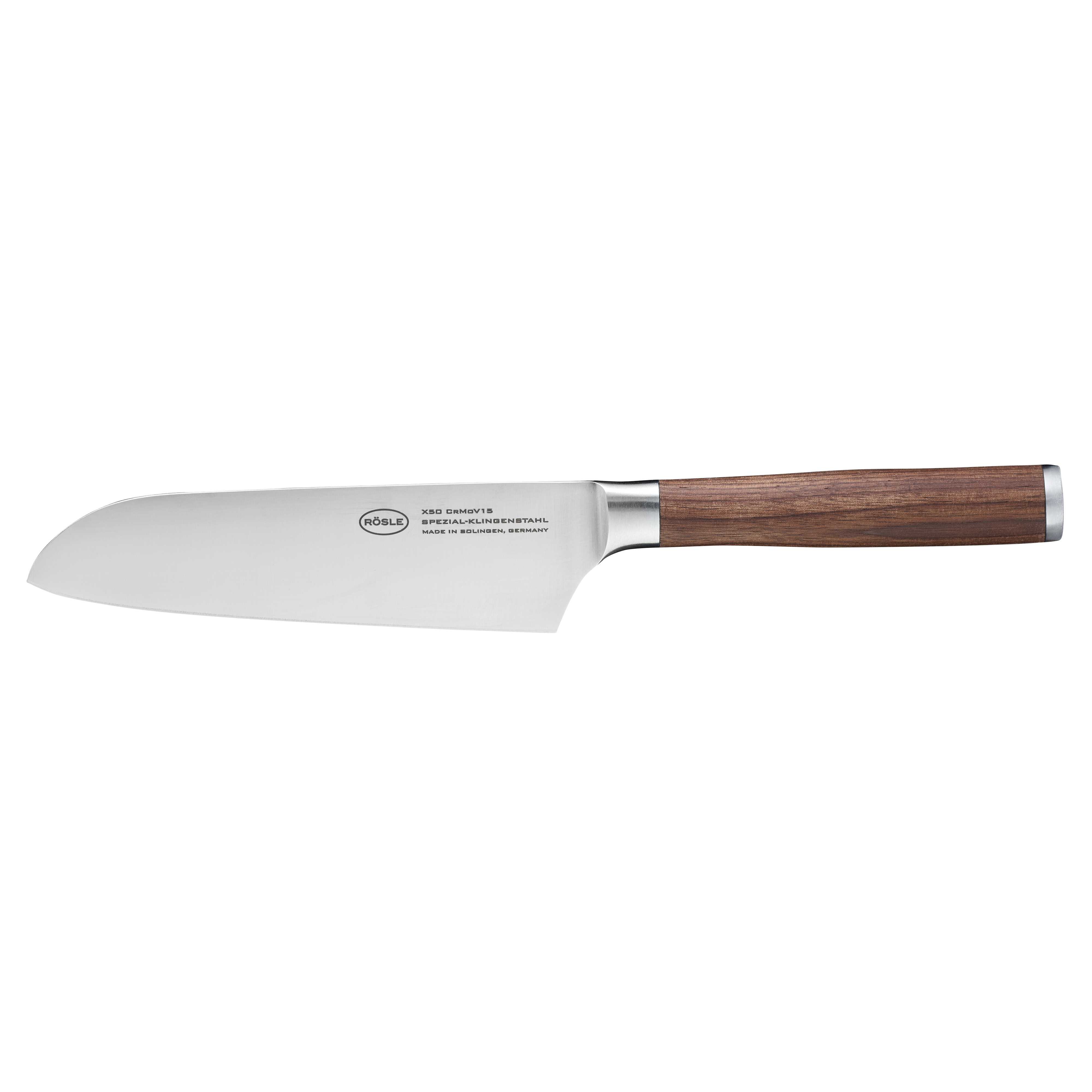 RÖSLE Masterclass santokukniv er en traditionel japansk universalkniv, hvis skarpe knivblad skærer kød, fisk og grøntsager.