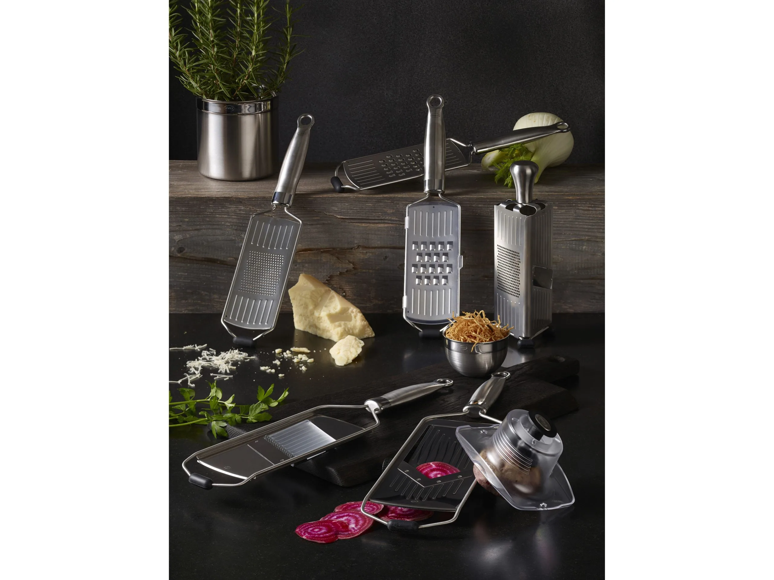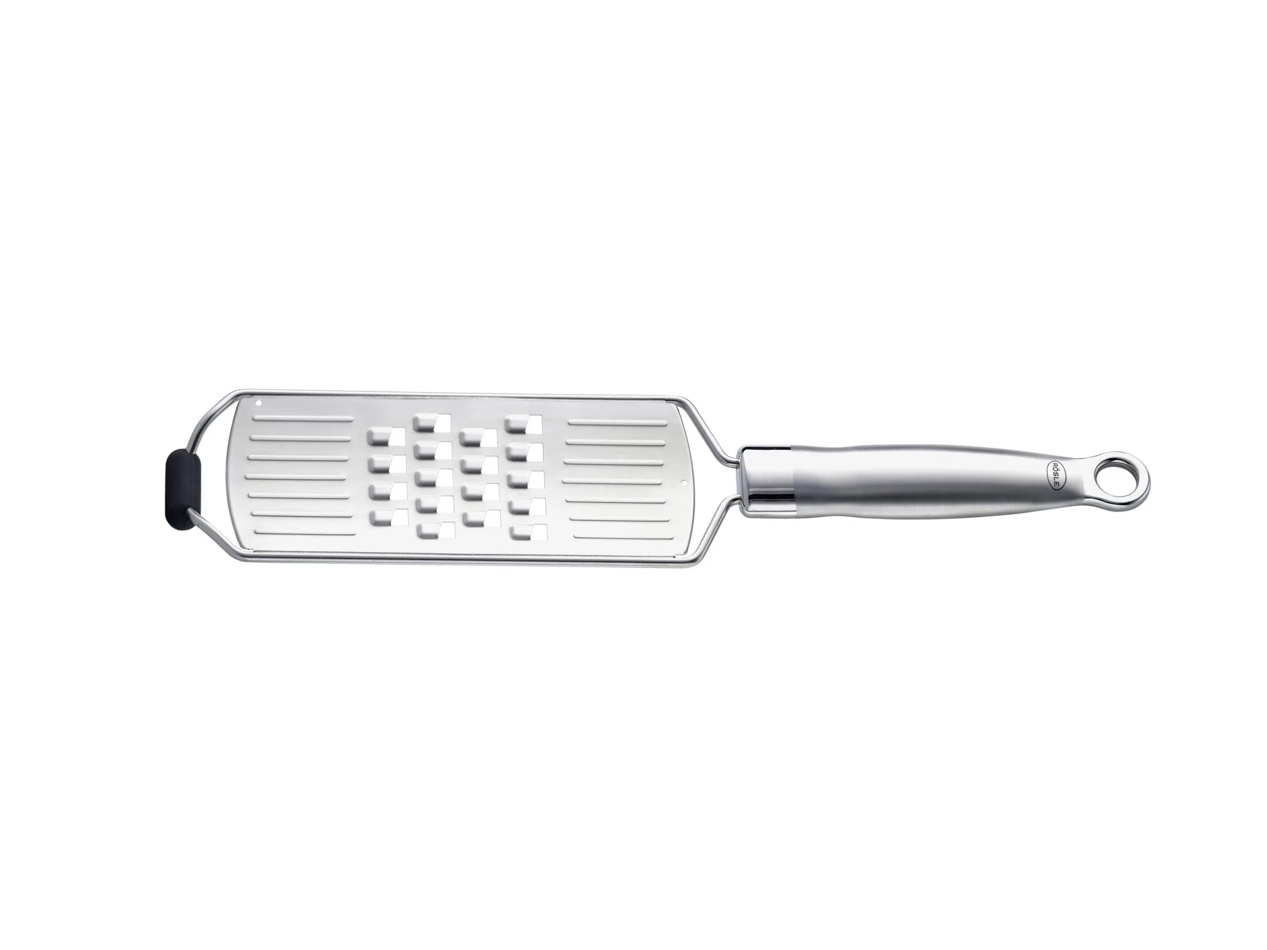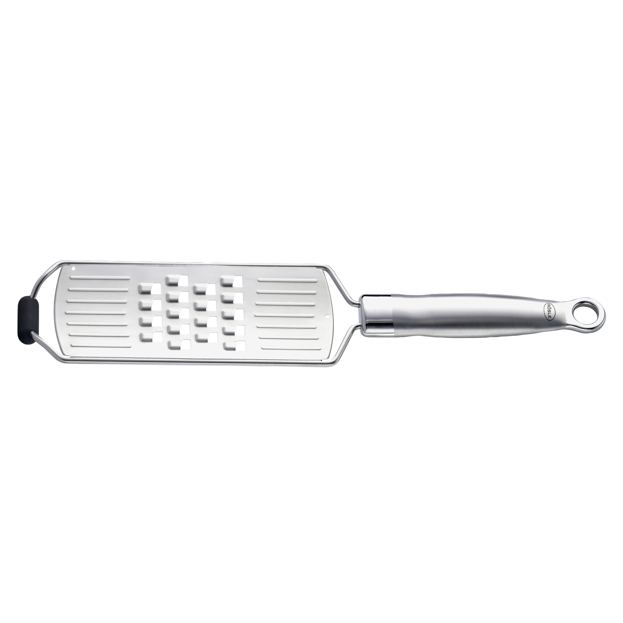 RÖSLE groft rivejern med håndtag lavet udelukkende af rustfrit stål. Det ergonomisk formede håndtag føles sikkert i hånden og har en praktisk krog til ophængning som perfekt afslutning. Uundværligt til fx råkostsalaten. Rivejernets specielt formede tænder sørger for hurtig rivning med minimal indsats.